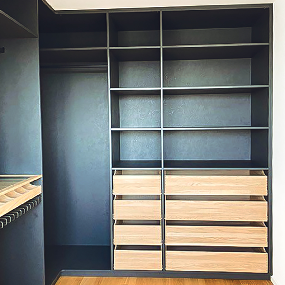 Diese Ankleidezimmer-Inspo präsentiert einen exklusiven Einbauschrank, der durch stilvolle Farb- und Materialkombinationen aus Dunkelgrau und Eichen-Echtholzfurnier besticht.