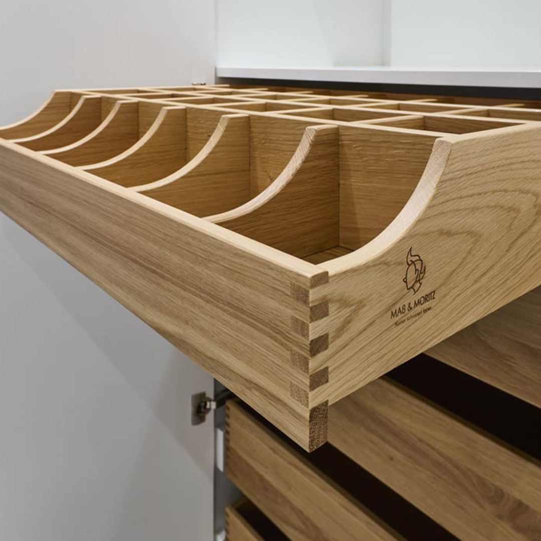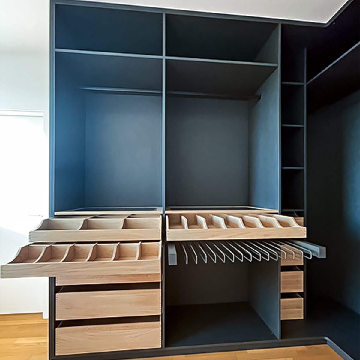 Unser Team hat kein Detail dem Zufall überlassen und intelligentes Design mit einer herausragenden Optik kombiniert. Eine geniale Idee für den begehbaren Ankleidezimmer-Schrank ist die von oben verglaste Schublade, die zum echten Hingucker wird. Der gut durchdachte Stauraum dieses Ankleidezimmers punktet mit raffinierten Ausstattungs-Extras. Speziell unterteilte Schubladen bieten Platz für Gürtel und Krawatten, während der Hosenauszug Ordnung schafft und für schnellen Zugriff sorgt. Lassen Sie sich inspirieren und entdecken Sie, wie elegant praktisches und modernes Design aussehen kann.
