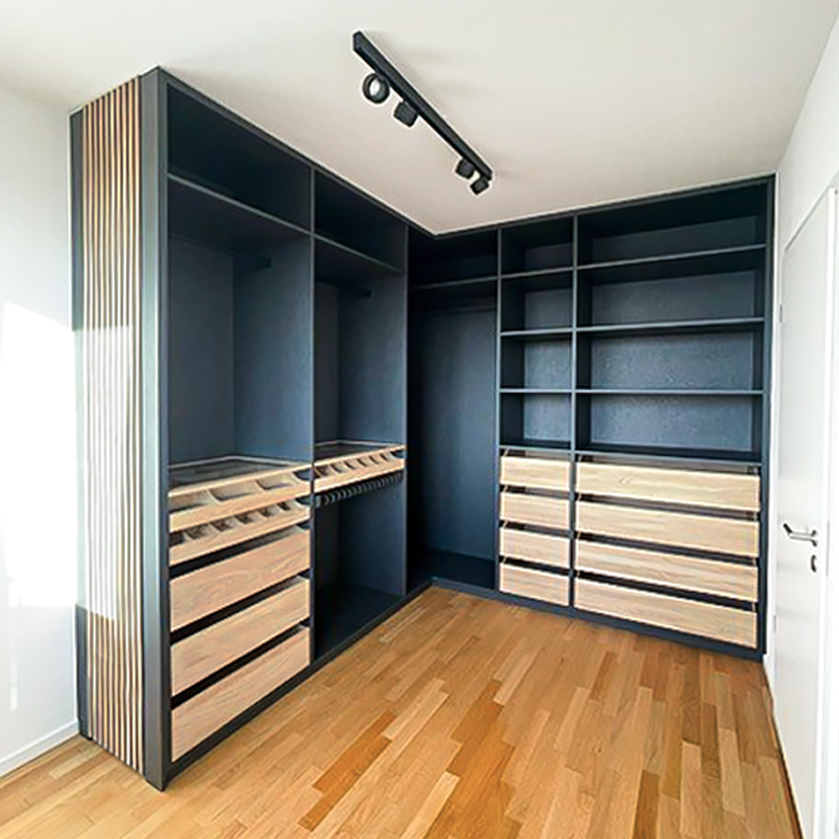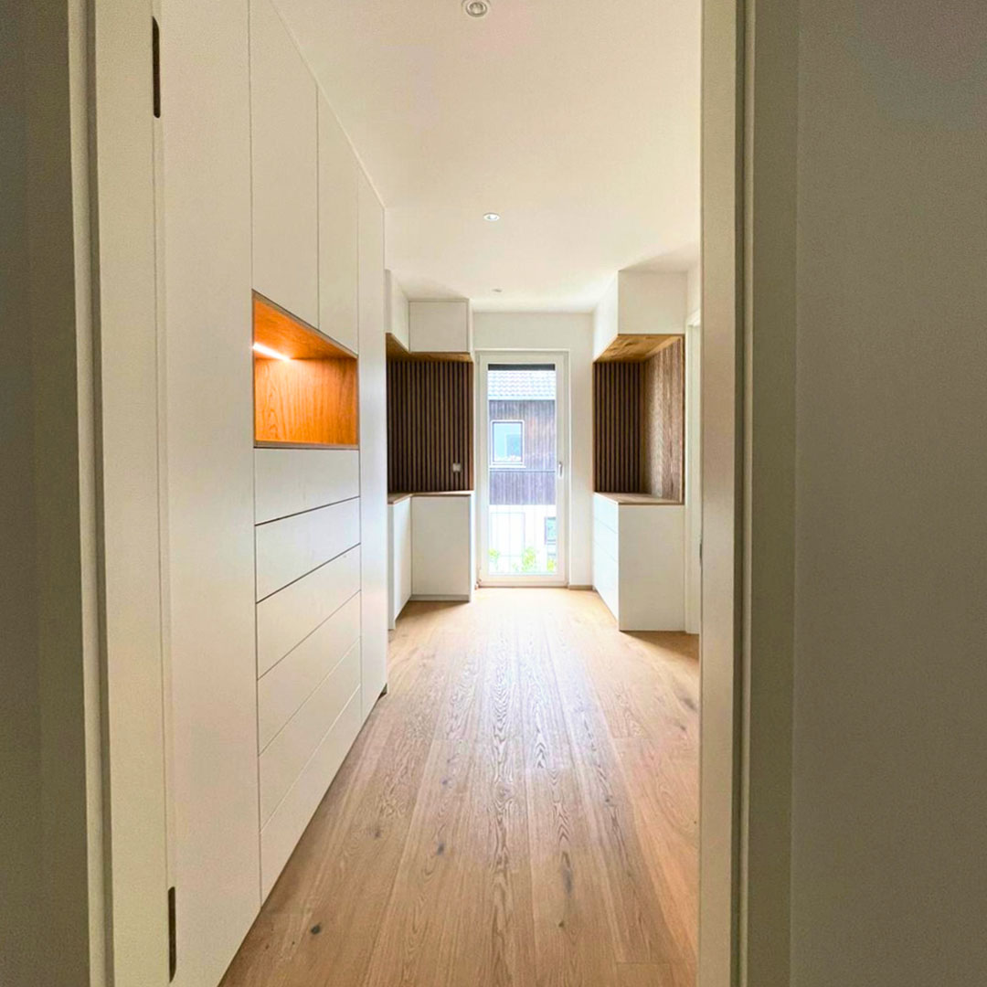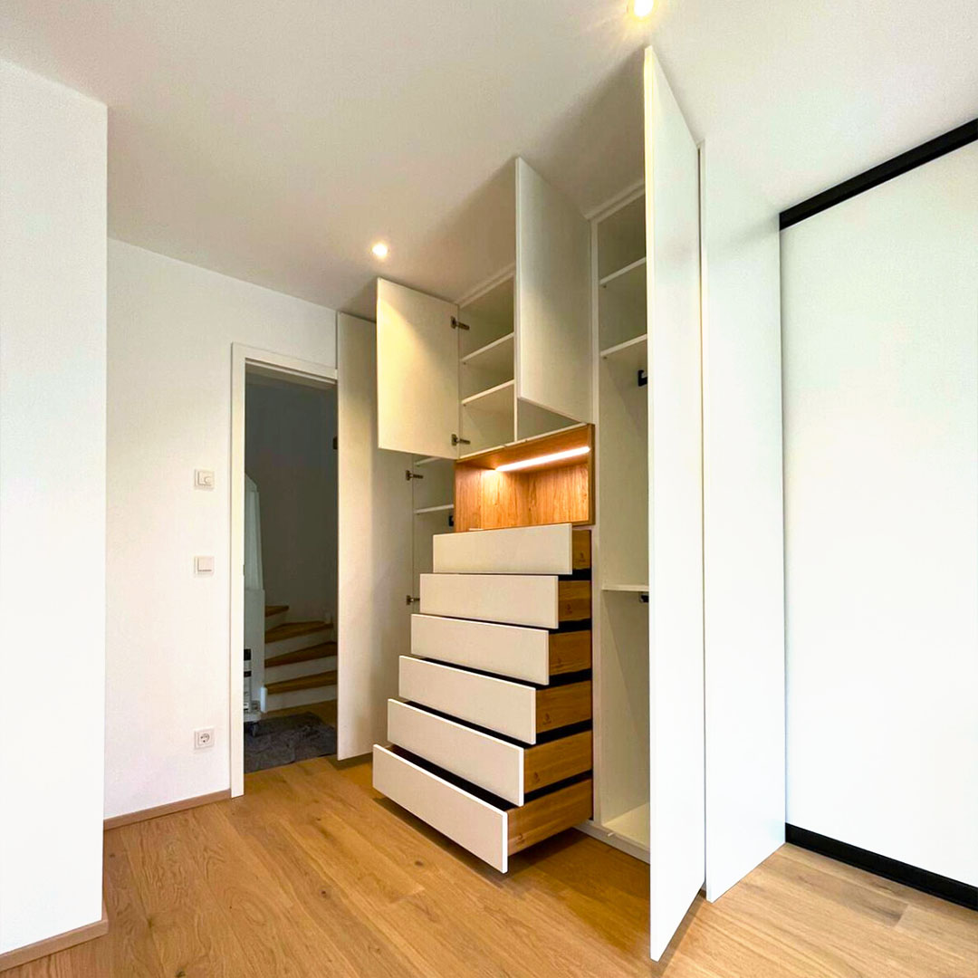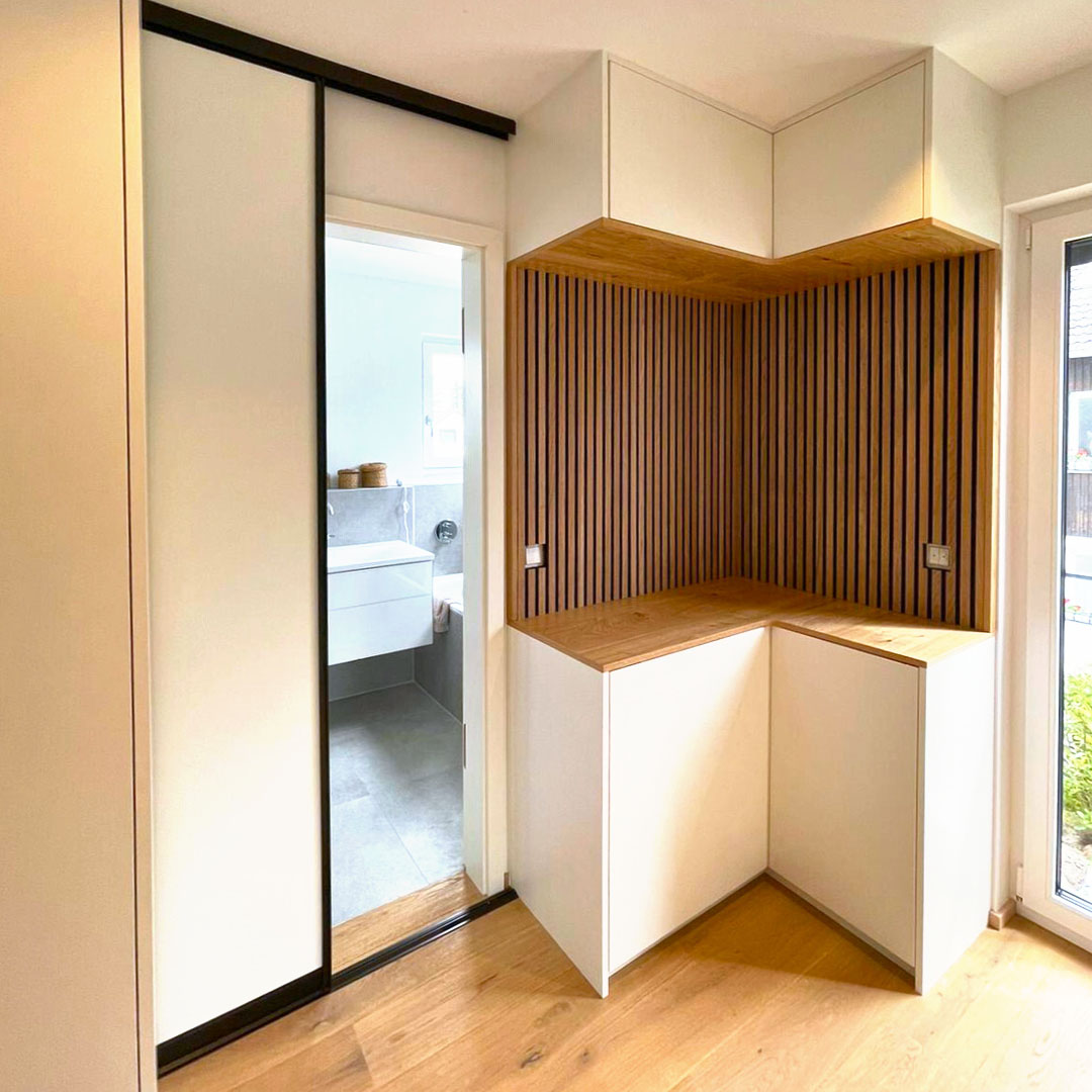 Mit unterteilten Schränken und trendigen Eichen-Wandpaneelen hat unser Team eine offene und moderne Optik gestaltet. Das Ergebnis ist ein elegantes Ankleidezimmer nach Maß mit viel Stauraum und perfekter Organisation aller Kleidung und Accessoires. Der indirekt beleuchtete offene Teil dieses begehbaren Kleiderschranks sowie die modernen Furniere sind optisches Highlights. Und als Clou haben wir noch eine platzsparende Schiebetür zum Bad integriert.