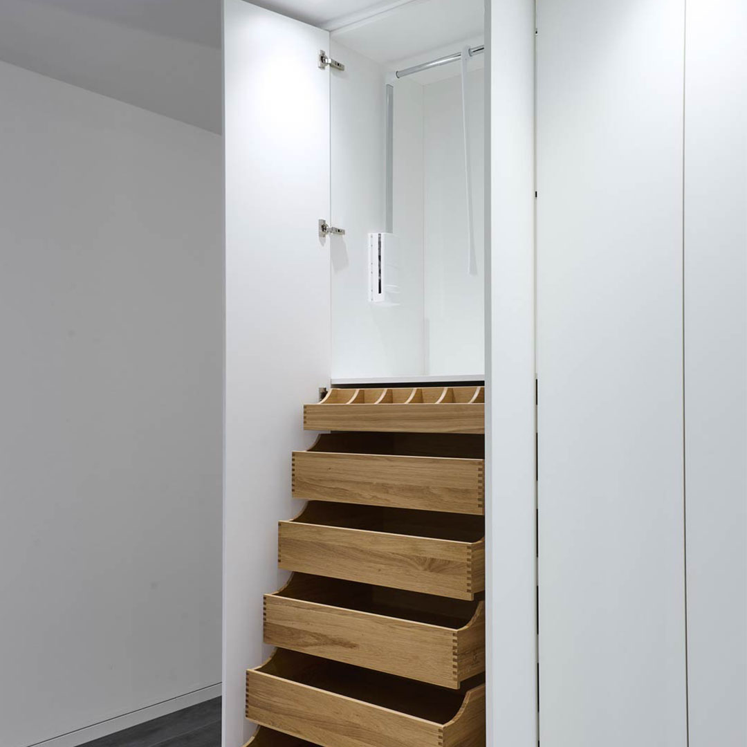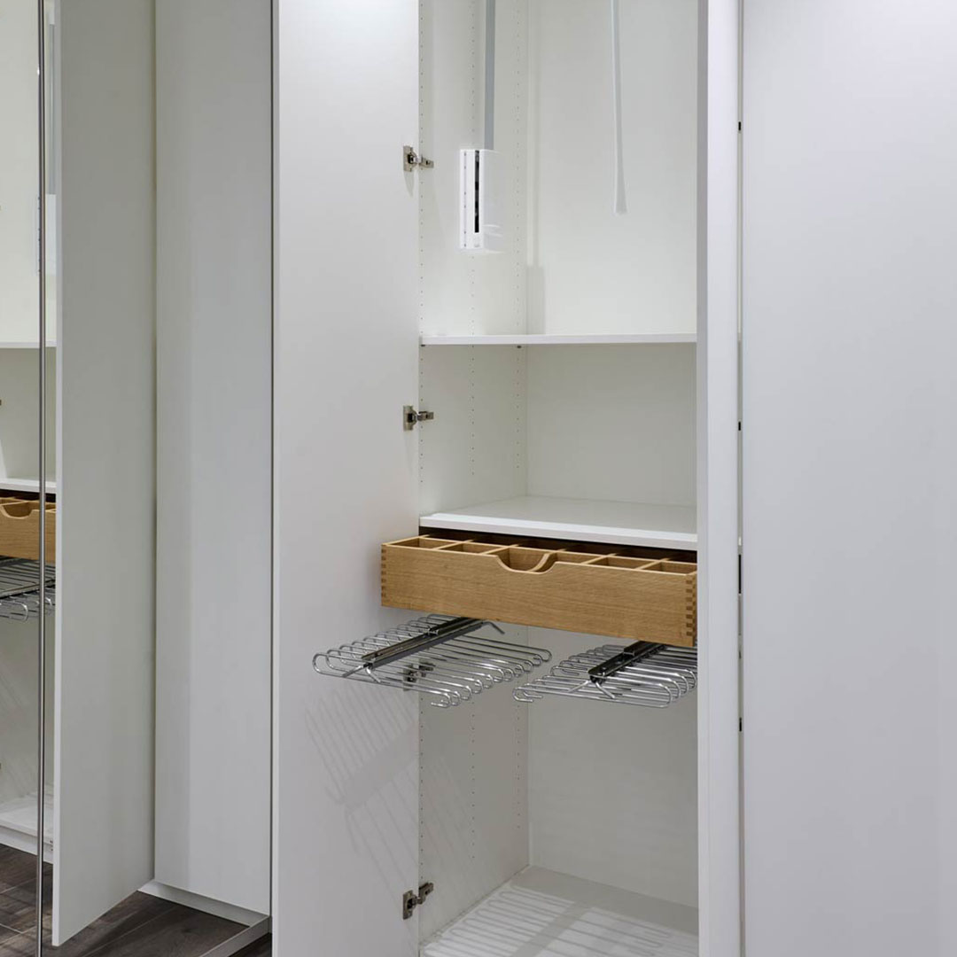Attraktive Garderobenhalter sind eine weitere Designidee für das kleine Ankleidezimmer, da sie den gesamten Raum nutzen. Massivholzschubladen aus Eiche bieten zudem viel Stauraum für Gürtel, Krawatten und viele Accessoires. Zwei integrierte Hosenauszüge bringen auch auf kleinem Raum Ihre Kleidung faltenfrei unter.