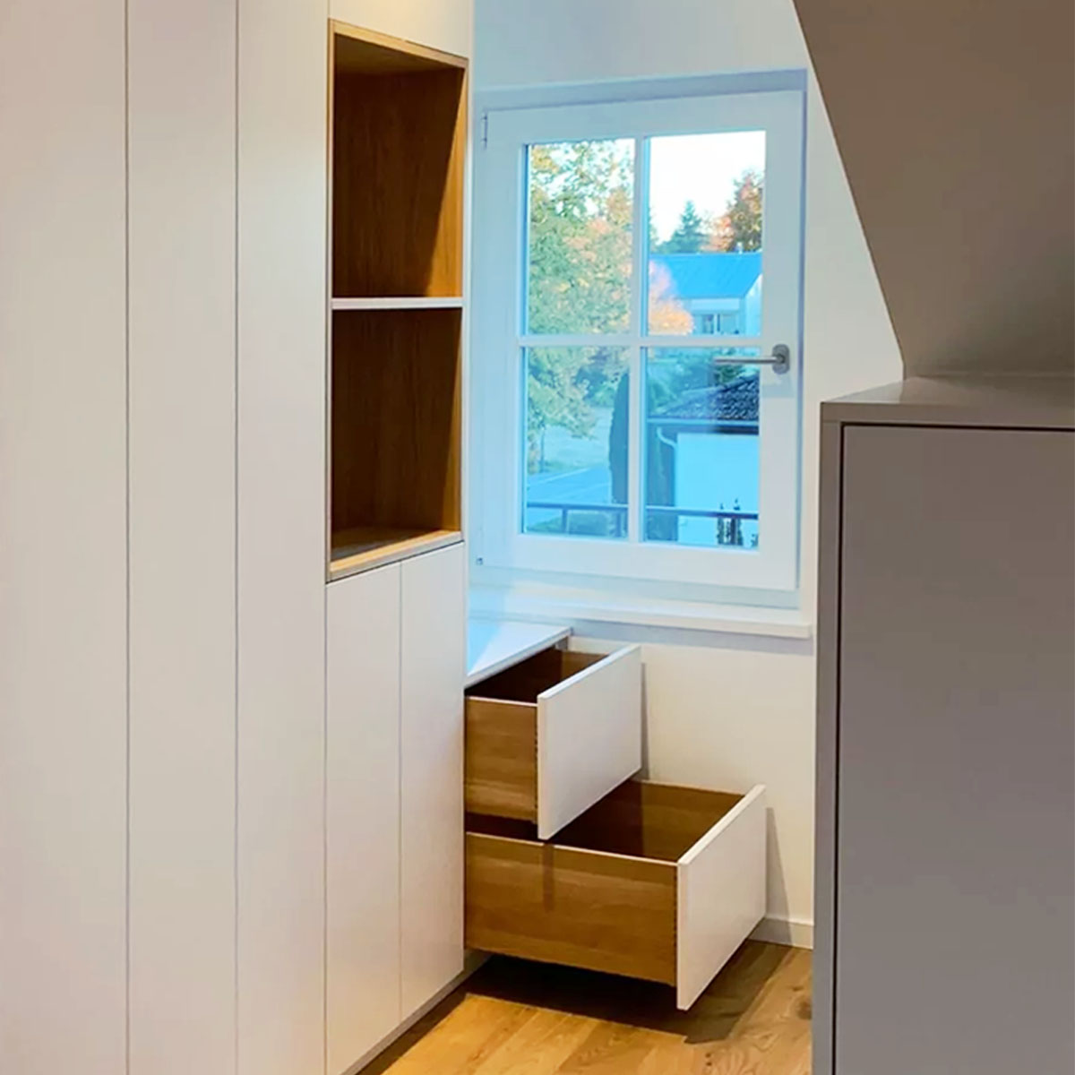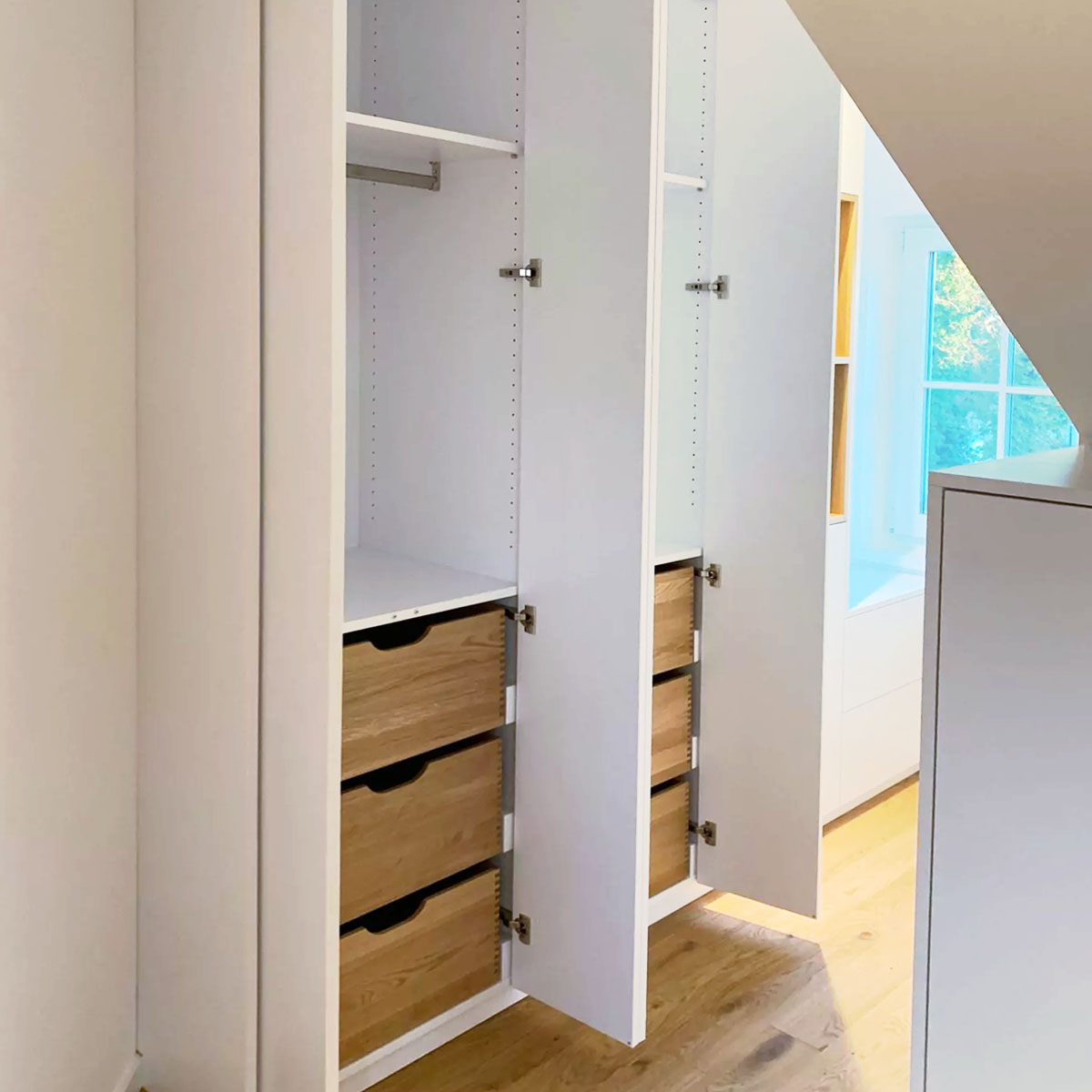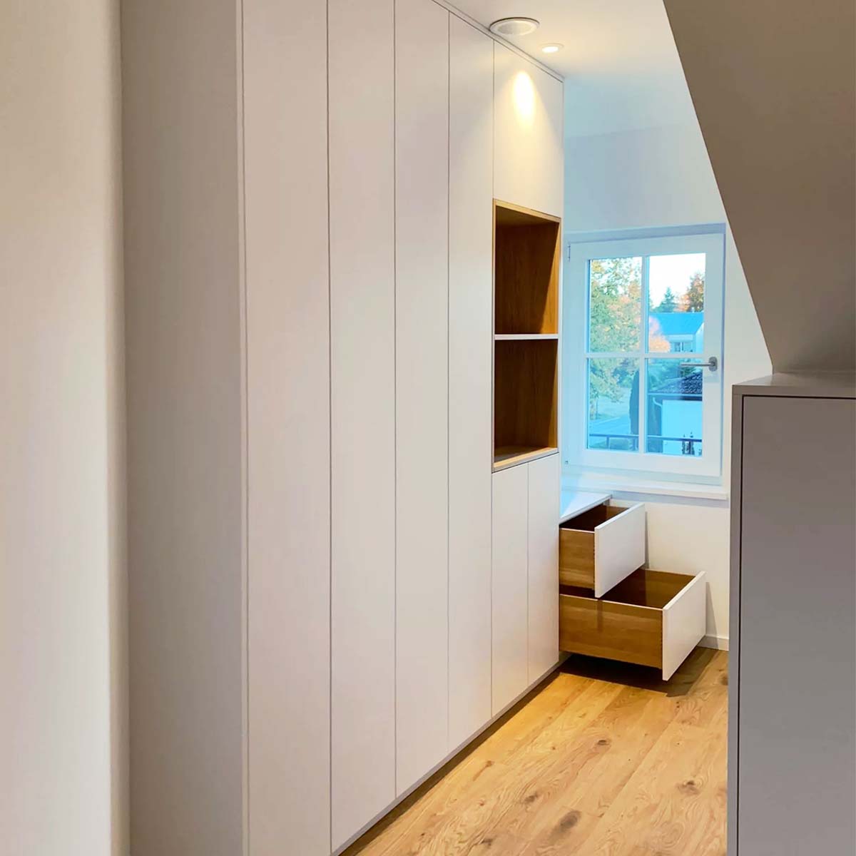 Ein elegantes, mattes Gletscherweiß vergrößert den kleinen Raum optisch und bildet die Grundlage für den kleinen begehbaren Kleiderschrank. Mit der Idee, ein aus Eichen-Echtholz-Furnier gestaltetes Element hinzuzufügen, hat unser Team einen echten Blickfang geschaffen. Der Einbauschrank nach Maß nutzt den Raum optimal aus; eine Sitzgelegenheit am Fenster ist mit eingebauten Schubladen versehen. Das Sahnehäubchen dieser Ankleidezimmer-Idee ist der integrierte schicke Drempelschrank, der extraviel Stauraum bietet. Ein perfektes Zusammenspiel von Design und Funktionalität!