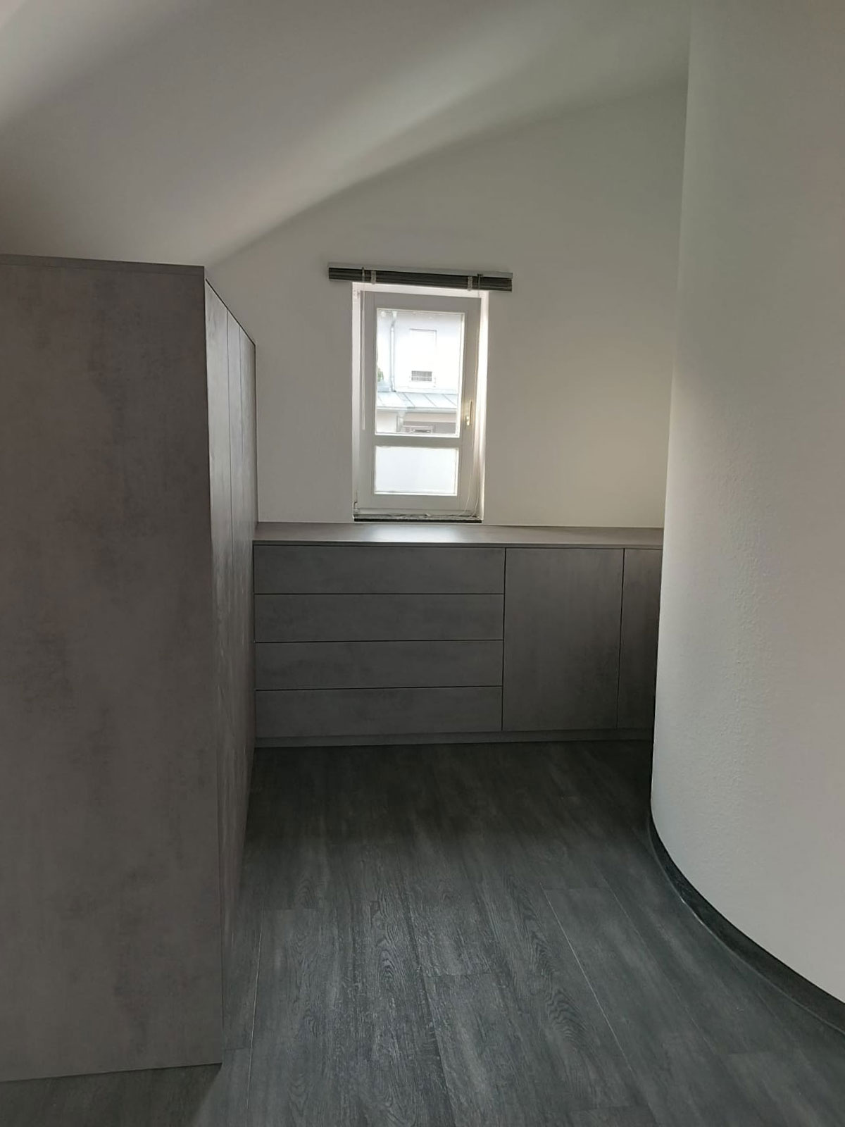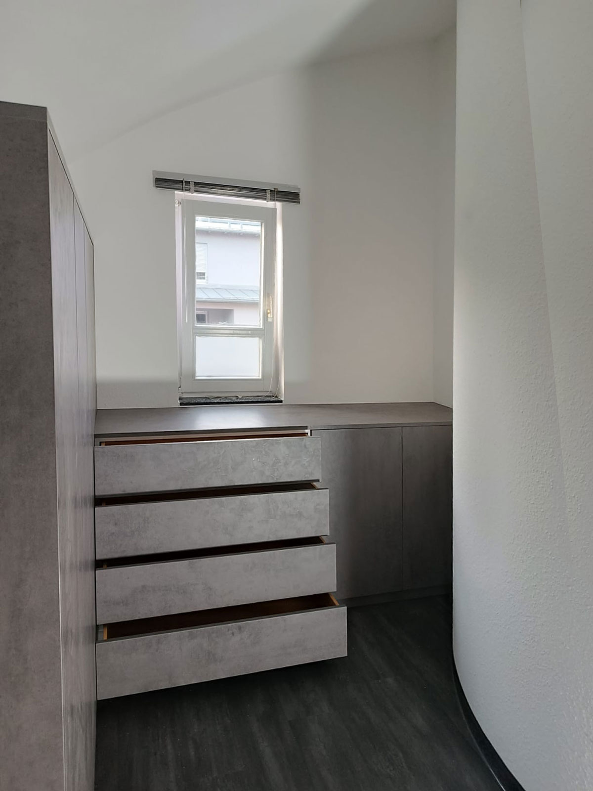 Bei der Gestaltung eines Ankleidezimmers mit Dachschräge in Nürnberg standen wir vor der Herausforderung eines ungewöhnlichen Raumschnitts mit runder Wand, Fenster und Dachschräge. Trotz dieser Besonderheit wünschte unser Kunde eine großzügige, dunkeltonige Lösung und bat um Ideen, dieses Ankleidezimmer auch geschickt als Raumteiler einzusetzen.