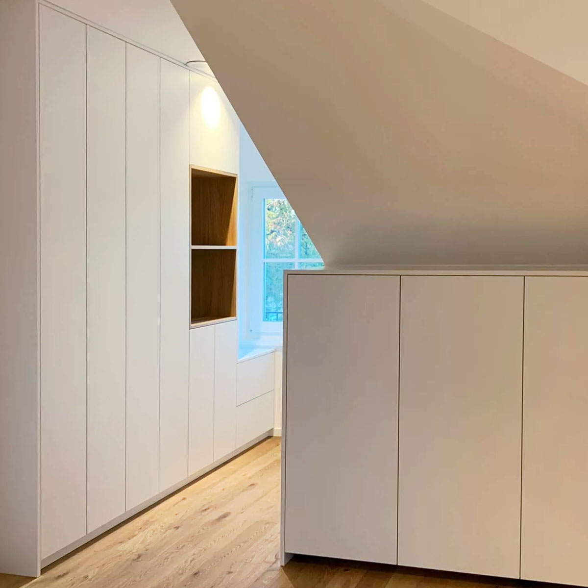 „Wie gestalte ich hier ein Ankleidezimmer?”, haben sich diese Münchner Kunden angesichts ihres kleinen Raumes mit Dachschräge gefragt. Sie baten unser Team um Ideen für einen kleinen begehbaren Kleiderschrank für zwei Personen. Gleichzeitig wünschten die Kunden so viel Stauraum wie möglich, ohne das natürliche Licht und den Schwenkbereich des Fensters zu blockieren.