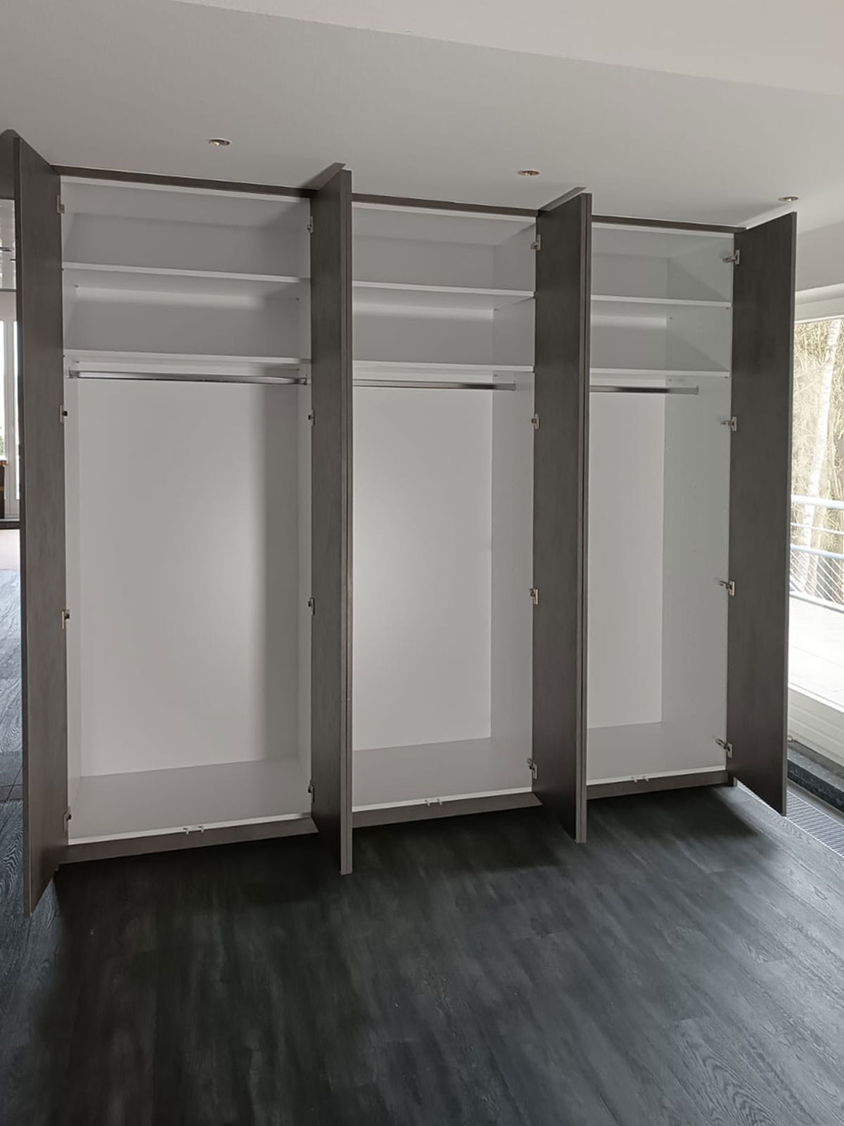 Sie suchen nach frischen Ideen, um aus einem Zimmer ein Ankleidezimmer zu machen? Bei diesem Beispiel wünschte sich der Kunde in einem großen Zwischenraum vor dem Bad einen ästhetisch ansprechenden begehbaren Kleiderschrank mit Wow-Effekt.