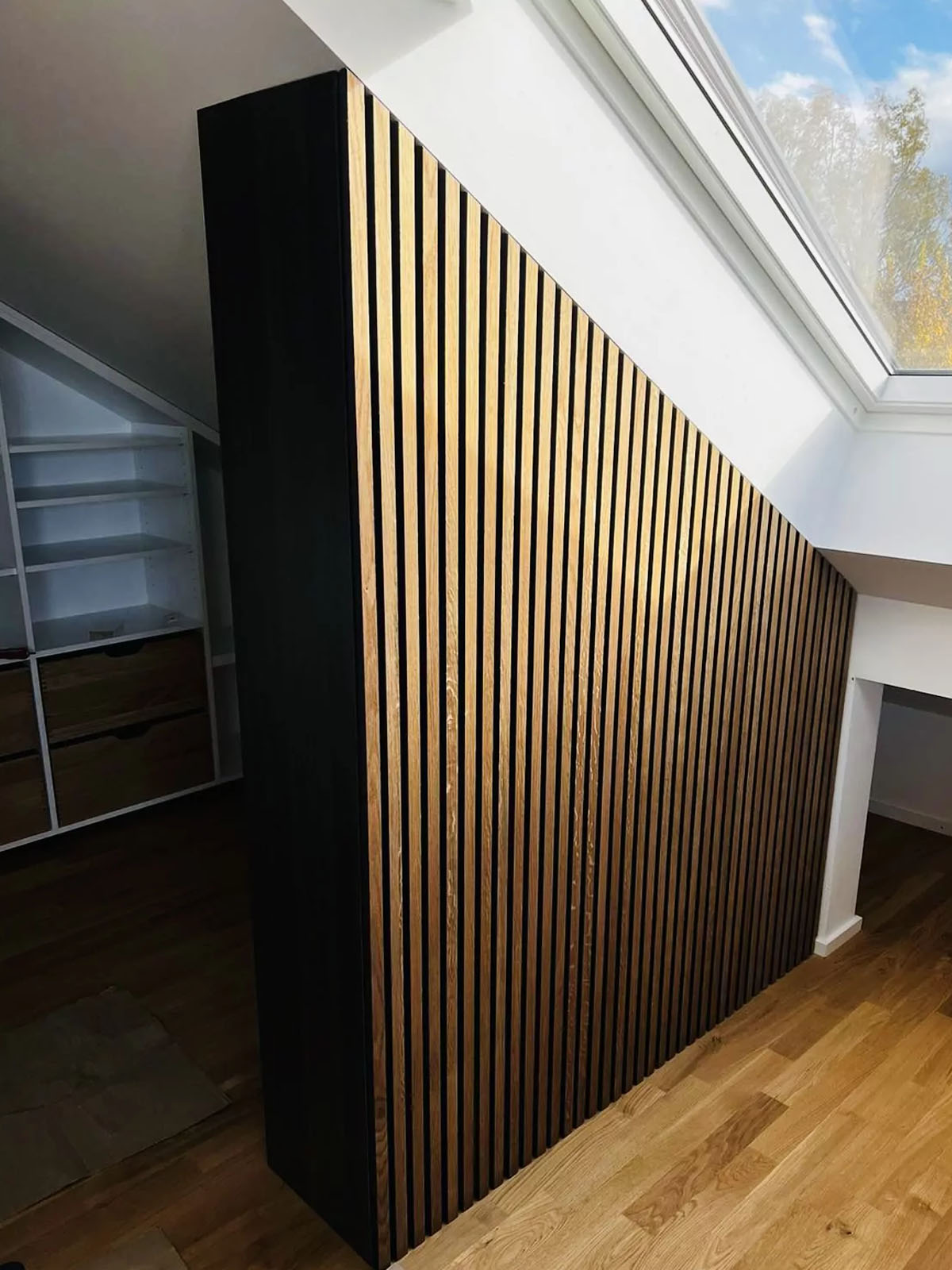 Das Ergebnis ist ein funktionaler Kleiderschrank und Raumteiler. Dachschrägen müssen für derartige Projekte millimetergenau ausgemessen werden, damit der Raum hamonisch und effizient ausgenutzt werden kann. So konnte unser Team auch zusätzlichen Stauraum für Kleidung und Accessoires aus dem vorhandenen Raum herausholen.