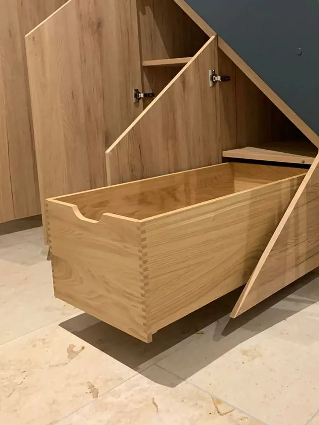 Für diesen Kunden im Großraum München designten wir diese optimale Lösung, die viel Stauraum unter ihrer Treppe schafft. Der maßgefertigte Garderobenschrank in Eiche San Remo, kontrastiert durch schwarze Blenden und beherbergt Details wie fingerverzinkte Massivholzschubladen in edler Optik und acht Tablarauszüge für Schuhe. Es war sogar noch Platz für einen Spiegel auf der Türinnenseite.
