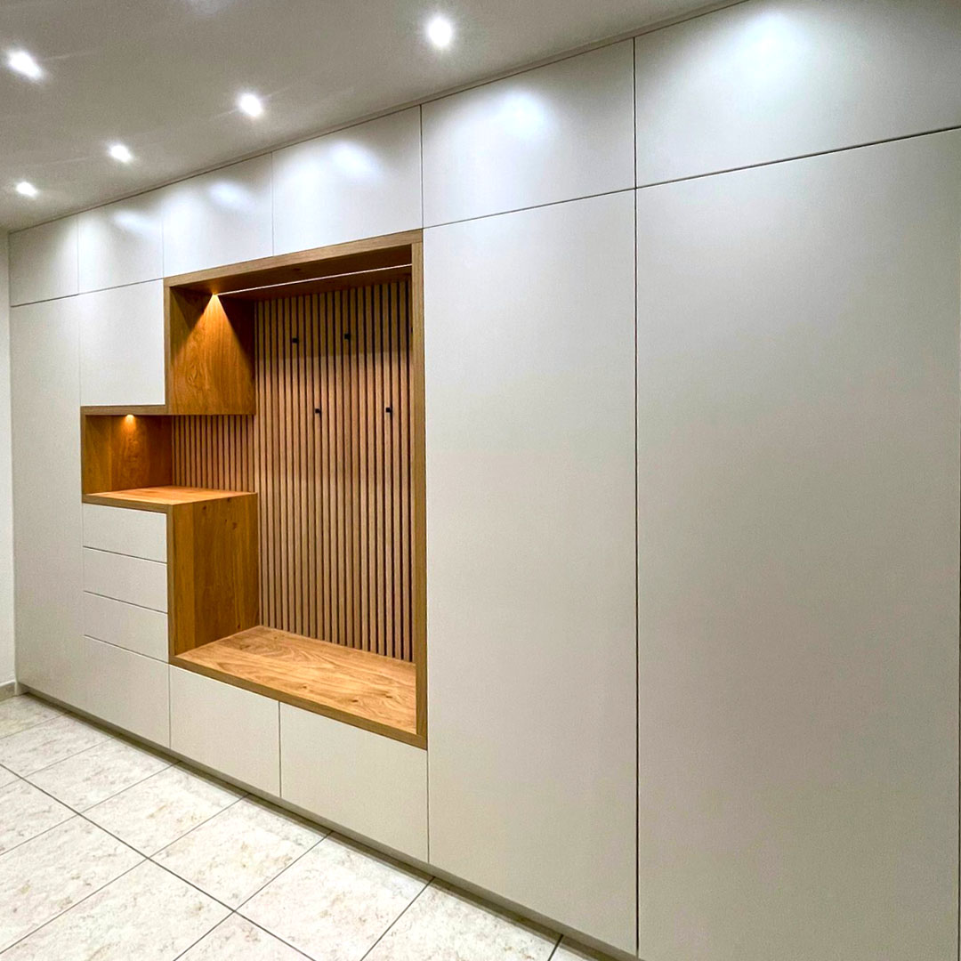 Ein besonderes Highlight sind die sorgfältig eingefrästen Lichtleisten im offenen Bereich der Garderobe. Sie setzen den Eingangsbereich gekonnt in Szene und schaffen einen einladenden, eleganten Eindruck.