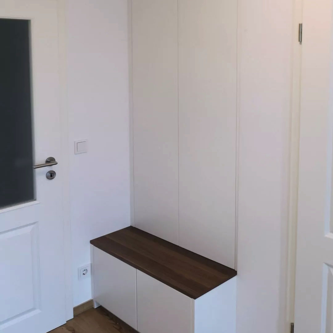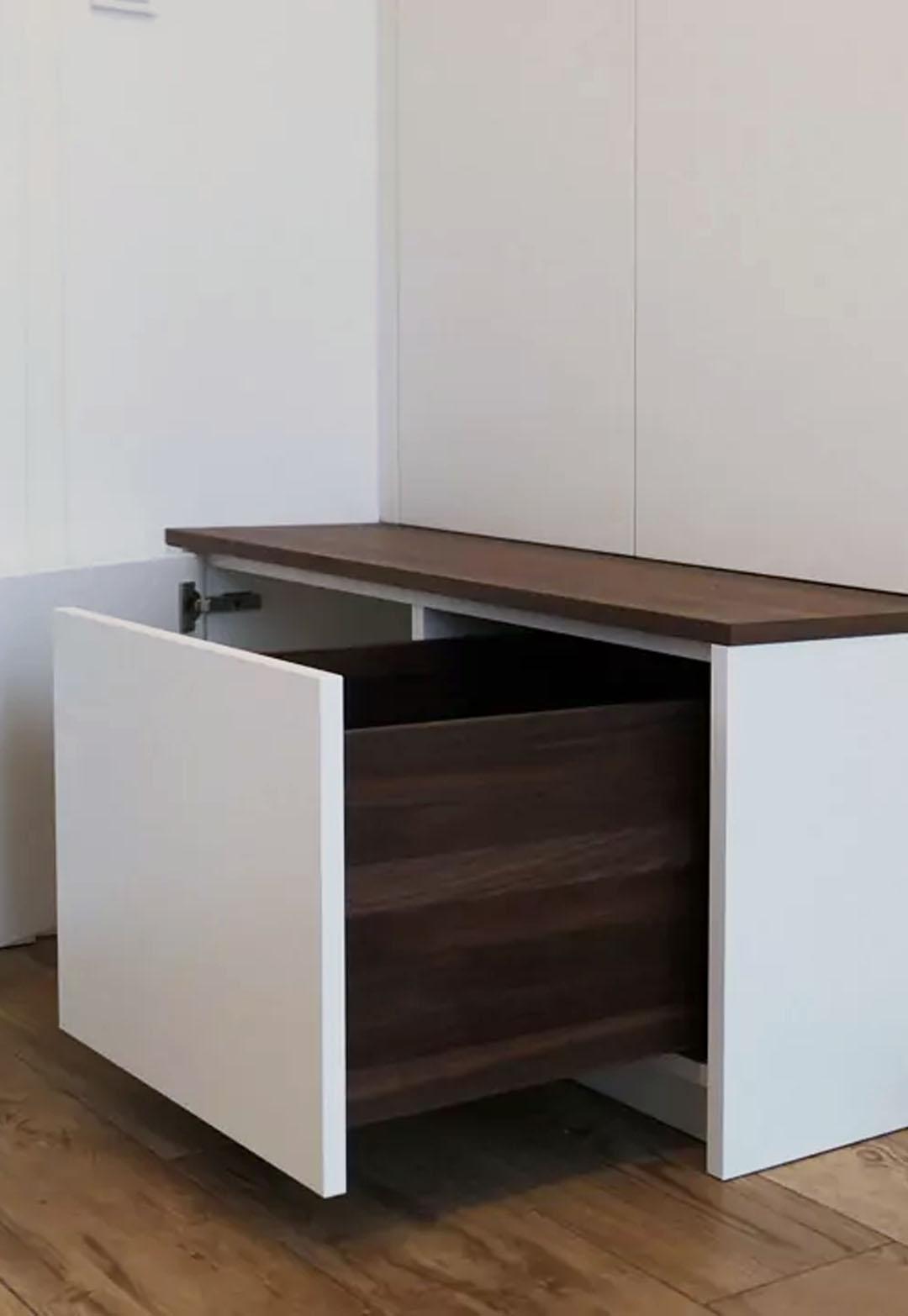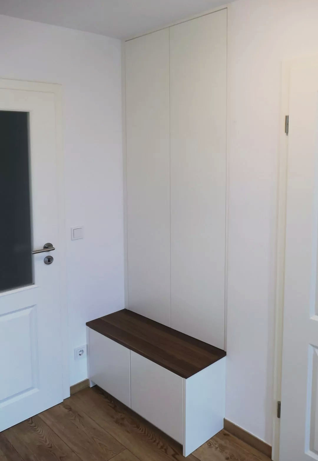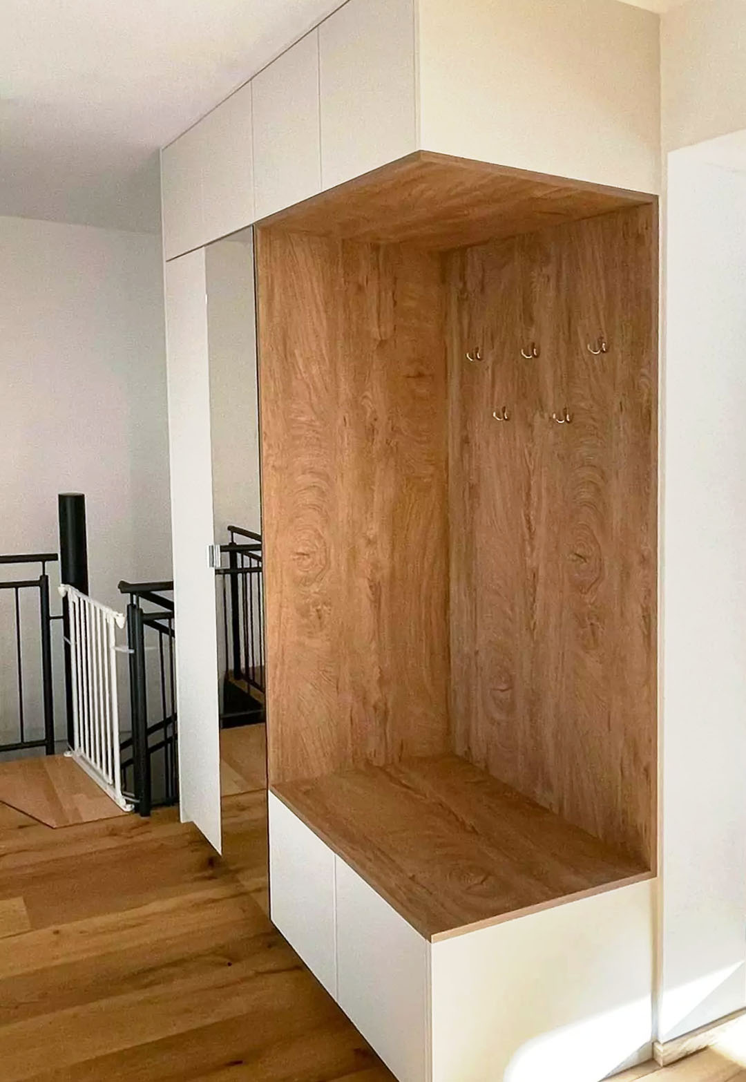 Der neue Garderoben-Einbauschrank bietet auch eine Nische mit Sitzgelegenheit zum An- und Ausziehen der Schuhe sowie eine Lösung für Gäste-Garderobe.