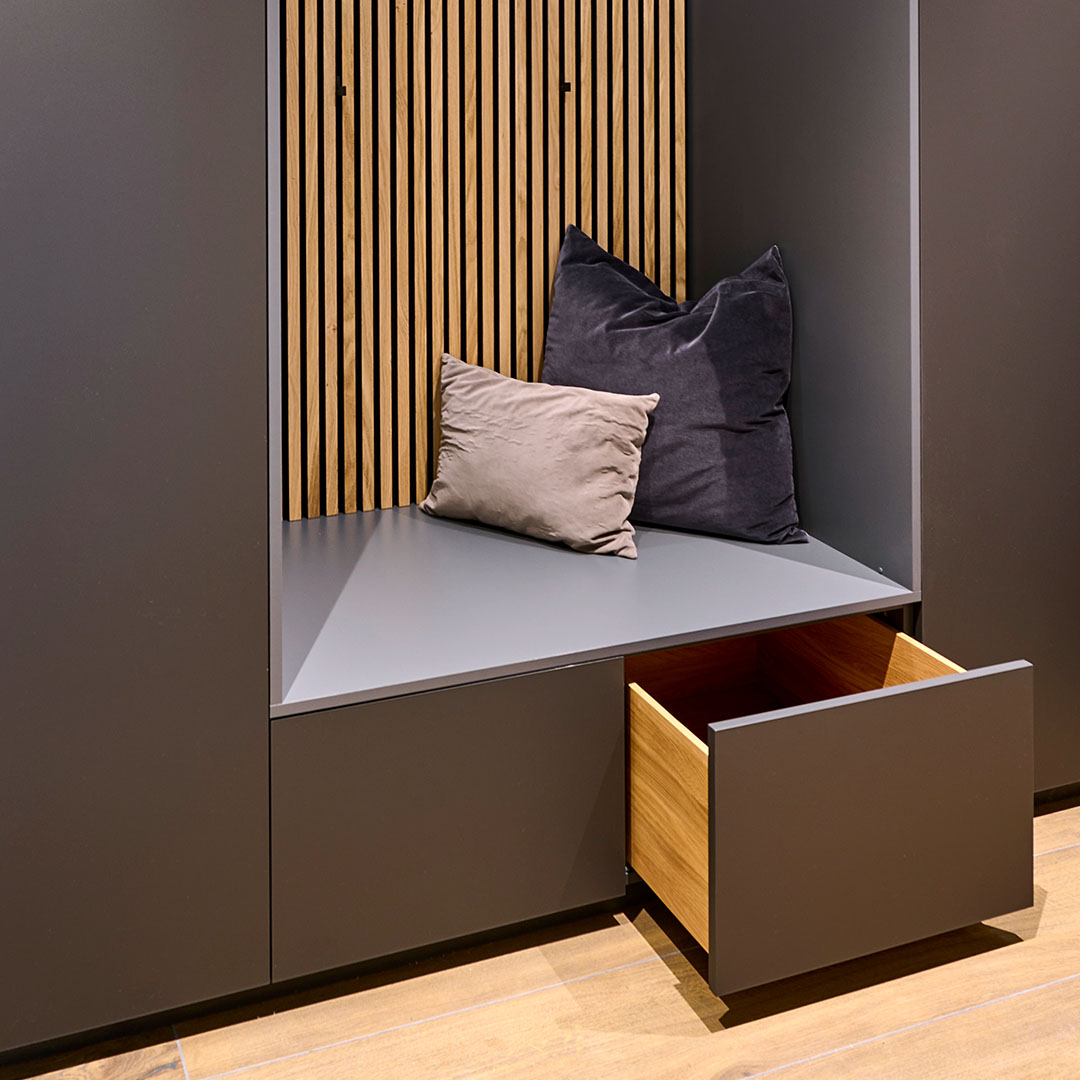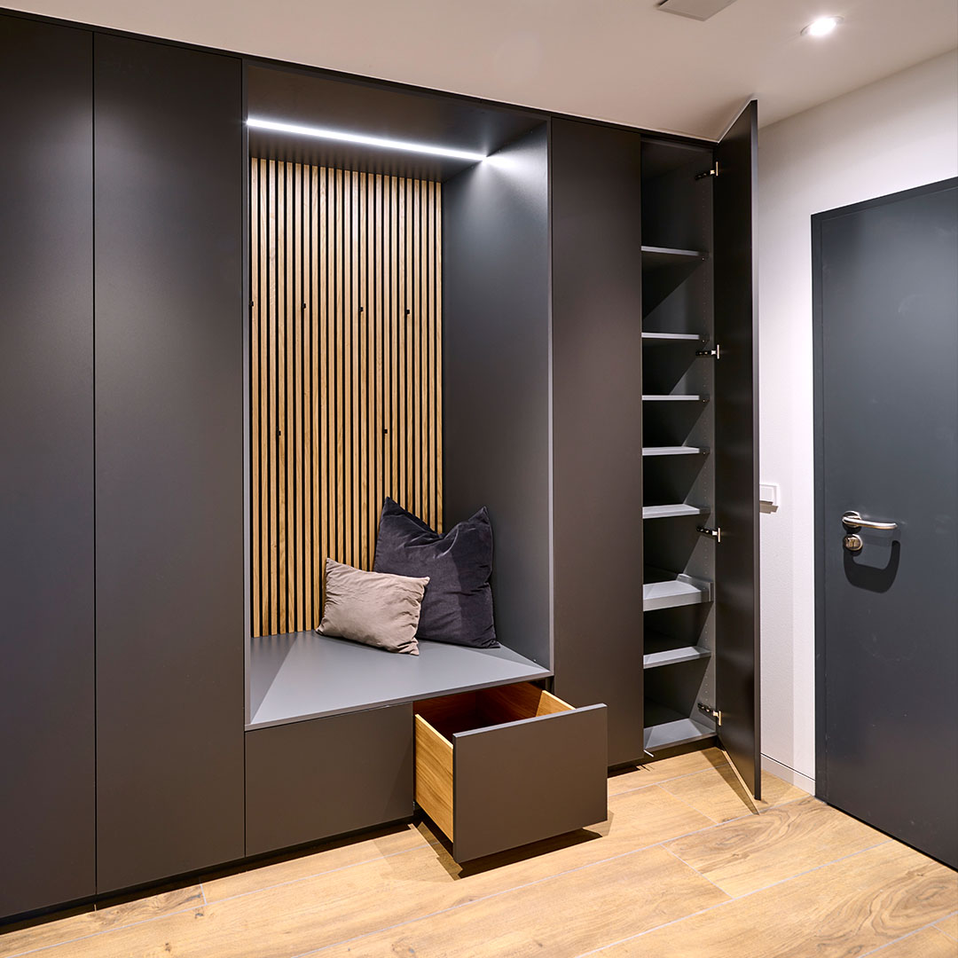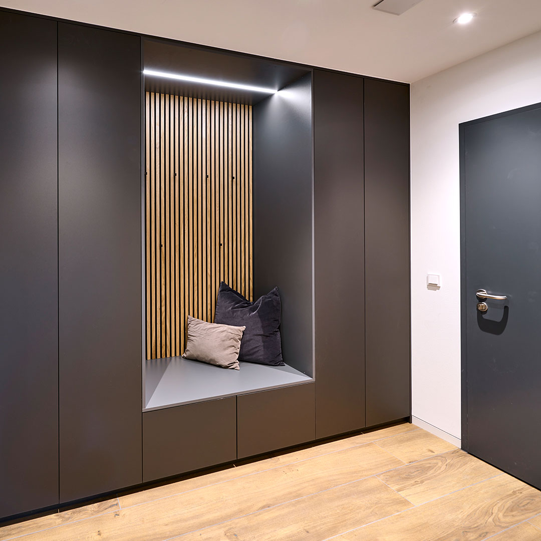 In die Garderobe im Eingangsbereich integrierten wir auch eine moderne und ergonomisch sinnvolle Sitzgelegenheit, um das An- und Ausziehen von Schuhen zu erleichtern.