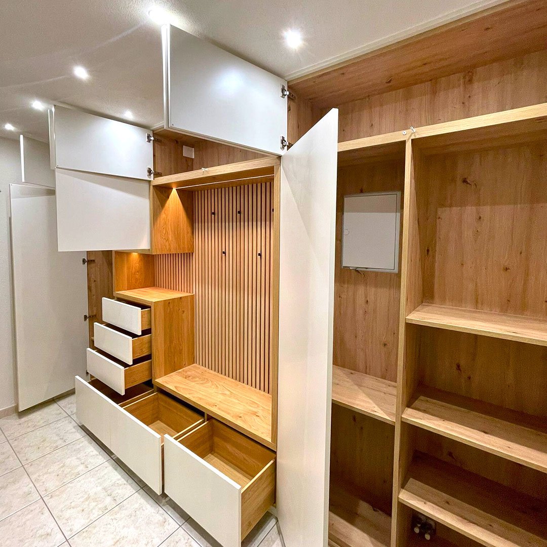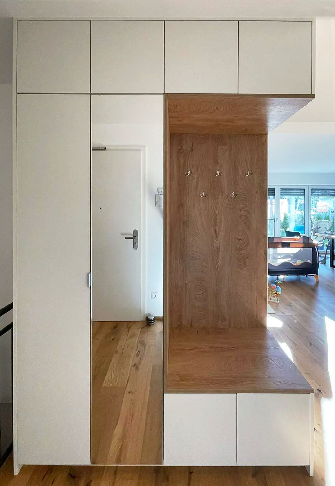 Unser Kunde aus dem Großraum München wünschte sich eine elegant aussehende Garderobe im Eingangsbereich mit viel Stauraum sowie einem offenen Bereich. Nach ausführlicher Beratung entschied sich die Familie für eine clevere Garderoben-Idee, die einen nahtlosen Übergang zwischen Flur und Wohnzimmer schafft. Gleichzeitig ist der offene Bereich so gestaltet, dass er den Blick ins Wohnzimmer freigibt und auf natürliche Weise für mehr Licht im Flur sorgt. Die Eichen-Optik des Fußbodens haben wir mit einem schlichten Weiß matt kombiniert, um eine zeitlose Optik zu gewährleisten.