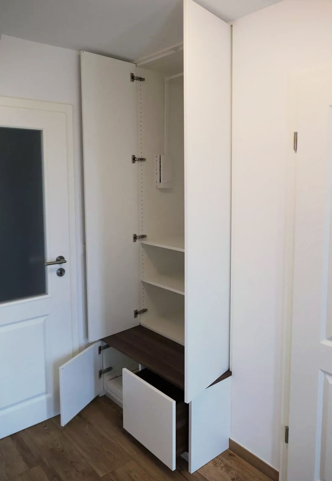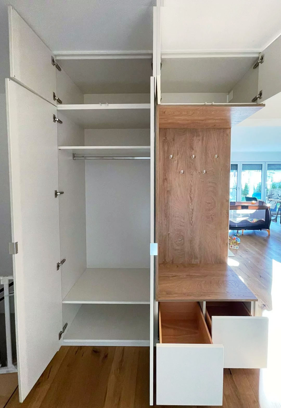 Dass uns keine Nische zu schmal ist, haben wir mit dieser kleinen Garderoben-Idee unter Beweis gestellt. Unser Münchner Kunde wünschte sich einen geschlossenen Schrank in einem kleinen Eingangsbereich. Also nahmen wir ganz genau Maß und begeisterten mit dieser ausgeklügelten Garderoben-Ecklösung.
