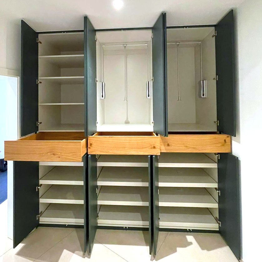 In Fürth durften wir eine der wohl eindrucksvollsten Garderoben realisieren, die den Balanceakt zwischen exklusivem Design und perfekter Ausnutzung des Raumes meisterlich vollführt. Der Kunde bat uns um Garderoben-Ideen für die Unterbringung von über 100 Paar Schuhen und zusätzlich ausreichend Stauraum bereitzustellen.