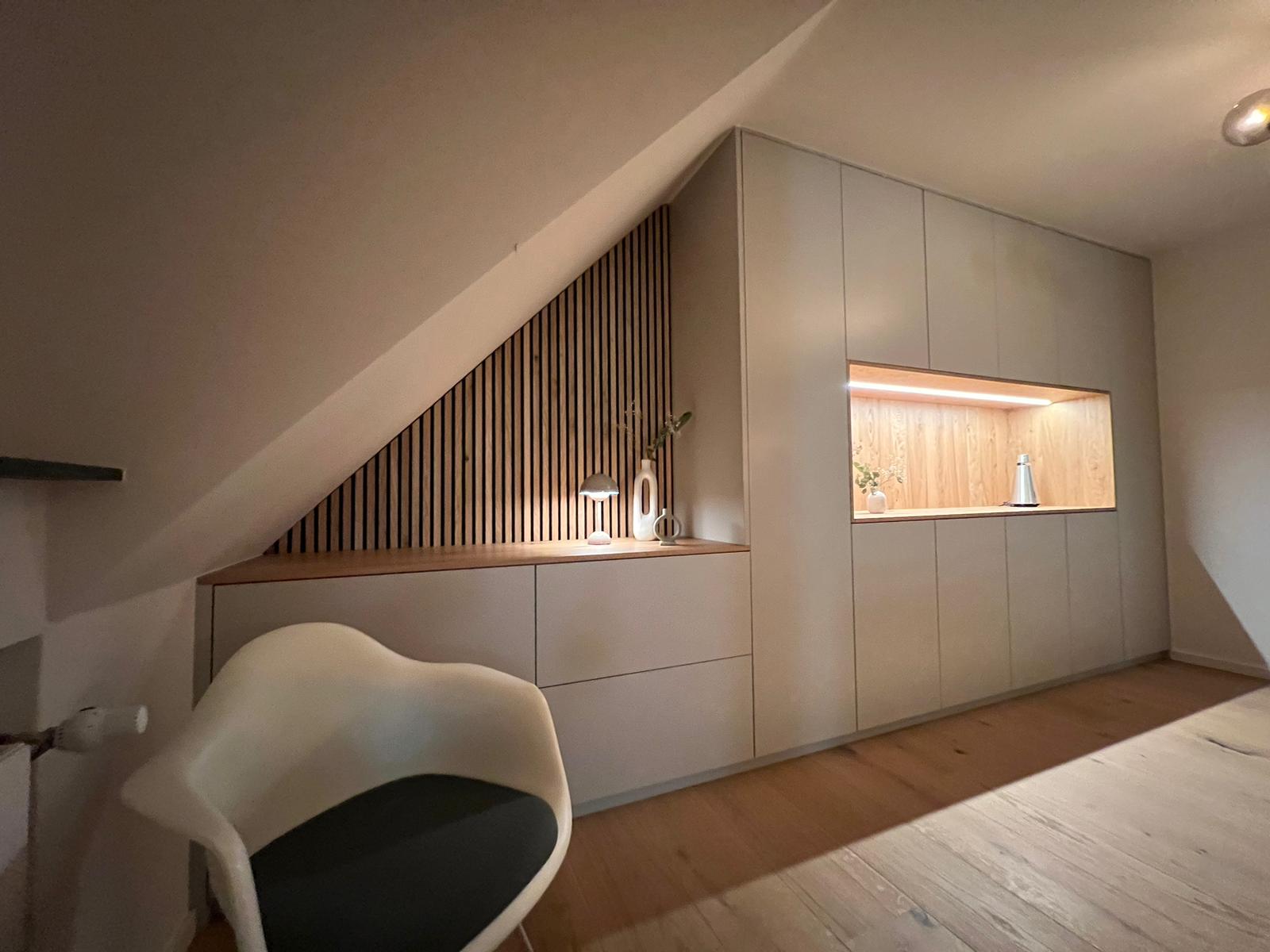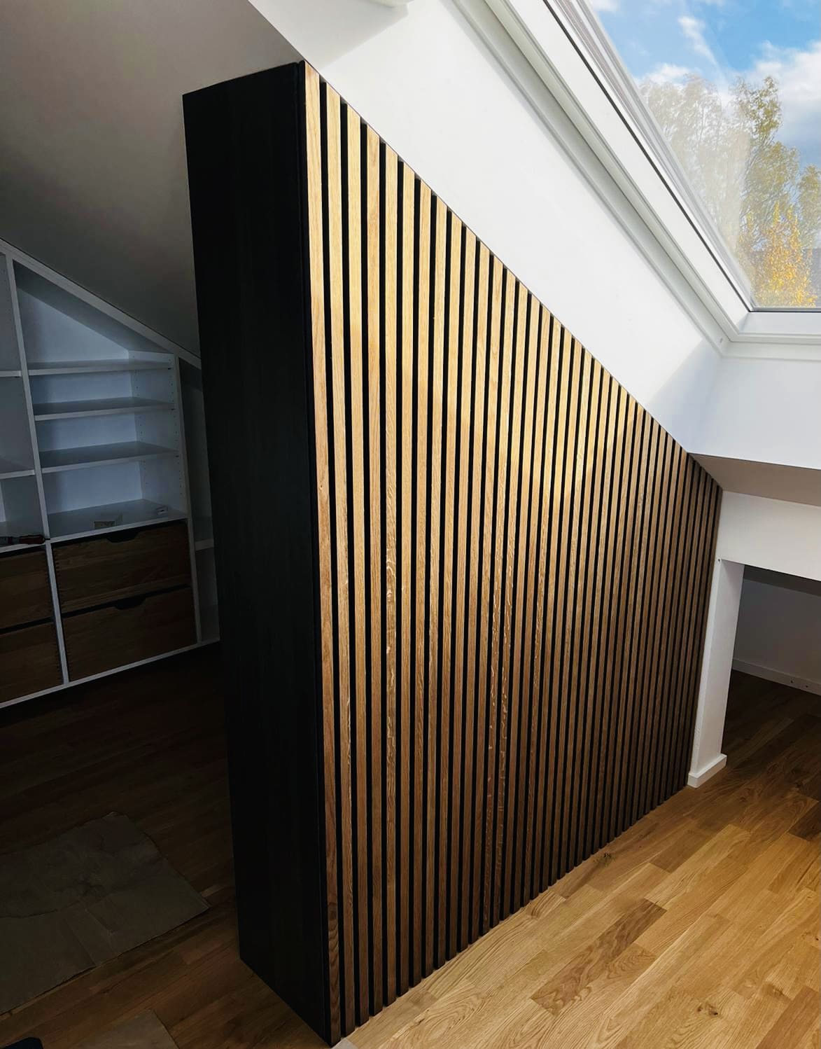 Akustikpaneele als Verkleidung für Raumteiler und für Schlafzimmer-Einbauschränke