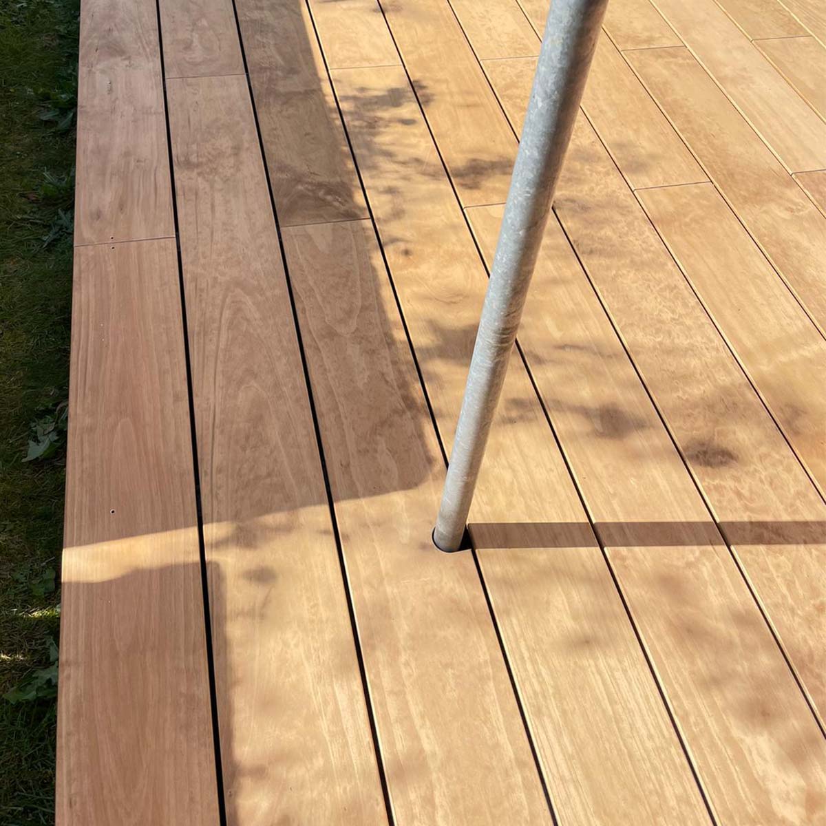 Die Terrasse wurde auf einer dauerhaften Aluminium-Unterkonstruktion errichtet, die sich durch Stabilität und Wetterbeständigkeit auszeichnet. Dieses Fundament gewährleistet, dass die elegante Accoya-Terrasse viele Jahre lang an Ort und Stelle bleibt.