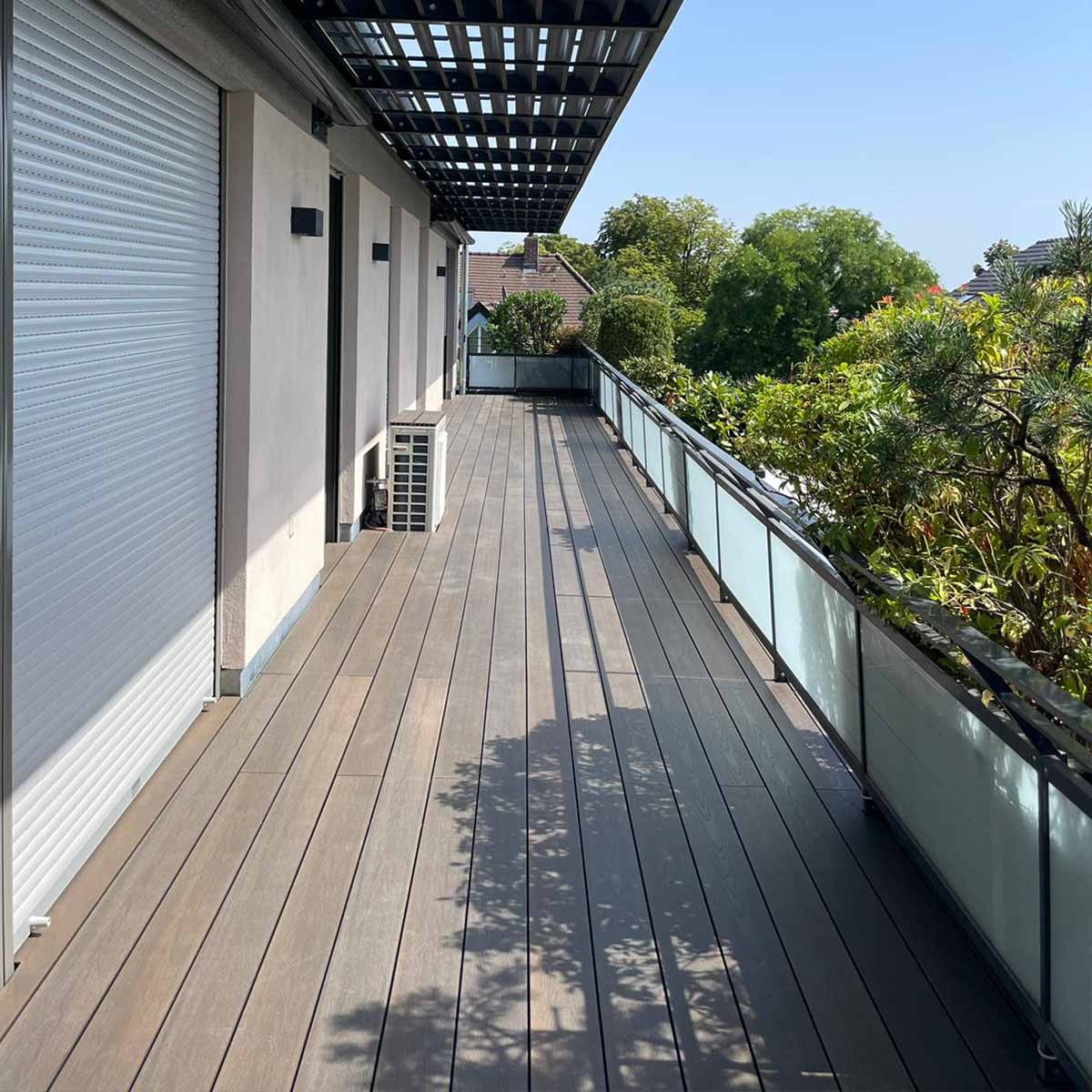 Diese 12,5 qm große Dachterrasse in Nürnberg war bereits in die Jahre gekommen. Die Terrassendielen waren morsch und der Wasserabfluss funktionierte nicht mehr ordnungsgemäß. Unsere Experten haben zunächst die gesamte alte Terrasse demontiert und fachgerecht entsorgt. Der Kunde hatte sich für ein neues Terrassendesign mit ästhetisch ansprechenden WPC-Terrassendielen in elegantem Schiefergrau entschieden.