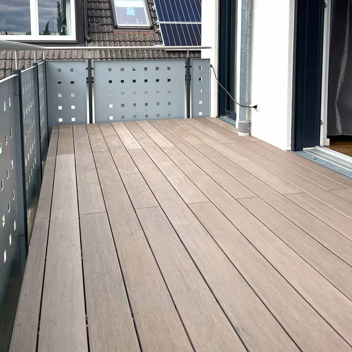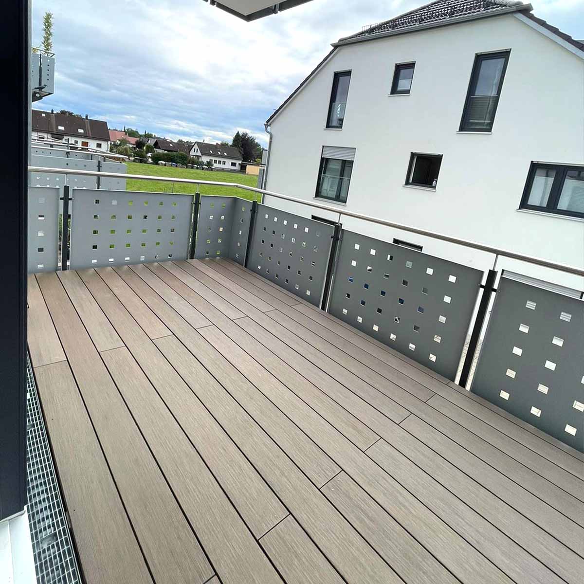 Dieser rund 12 m2 große Balkon eines Mehrfamilienhauses in Bobingen war zuvor mit einem Holzdeck versehen, das bereits nach wenigen Jahren morsch wurde. Nach umfassender Beratung beschlossen unsere Kunden, den Balkon mit einem WPC-Belag in edlem Braun neu zu gestalten. WPC-Materialien geben hervorragende Terrassenbeläge für Familien mit Kindern ab. WPC ist äußerst langlebig und sorgt für ein herrliches Barfußgefühl. Die Dielen werden selbst bei hohen Außentemperaturen nicht zu warm und können auch keine Splitter und Spreißel bilden. Das Mass & Moritz-Team hat den alten Belag entsorgt und die neu gestaltete Balkonterrasse inklusive Unterkonstruktion an nur einem Tag verlegt.