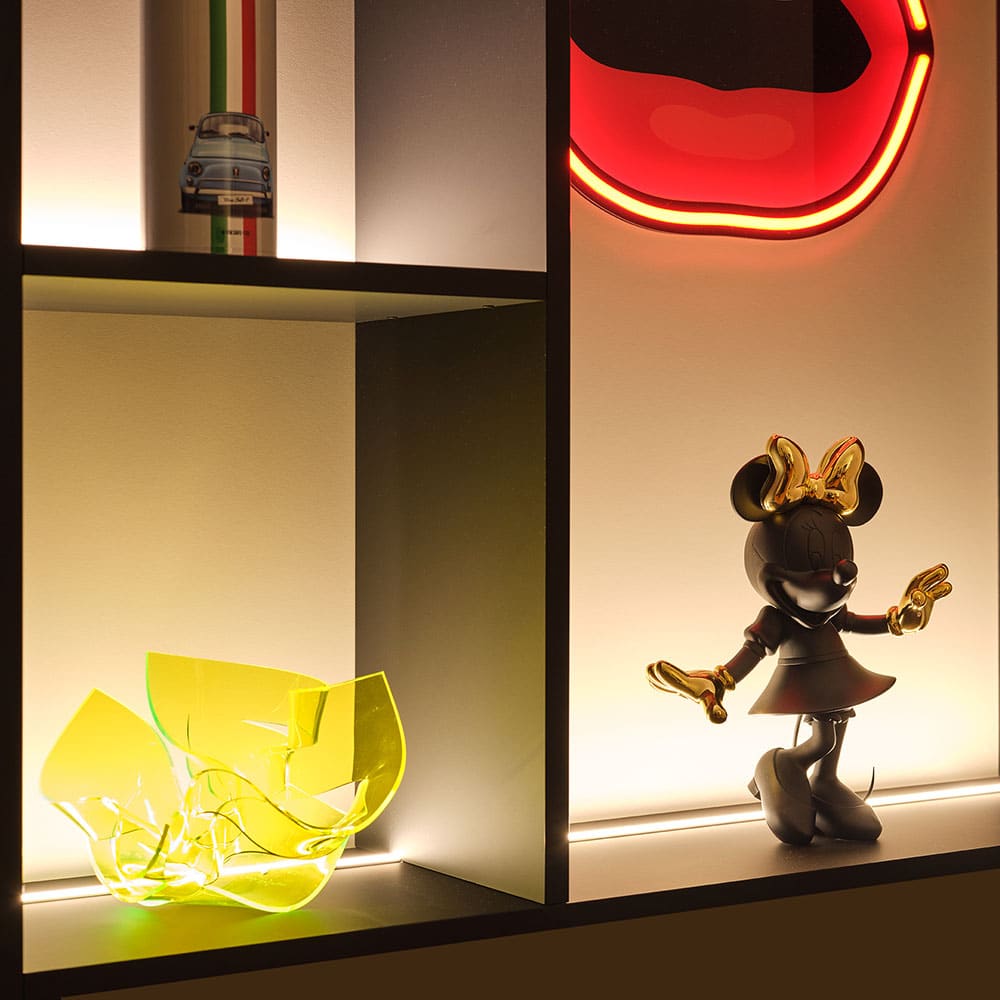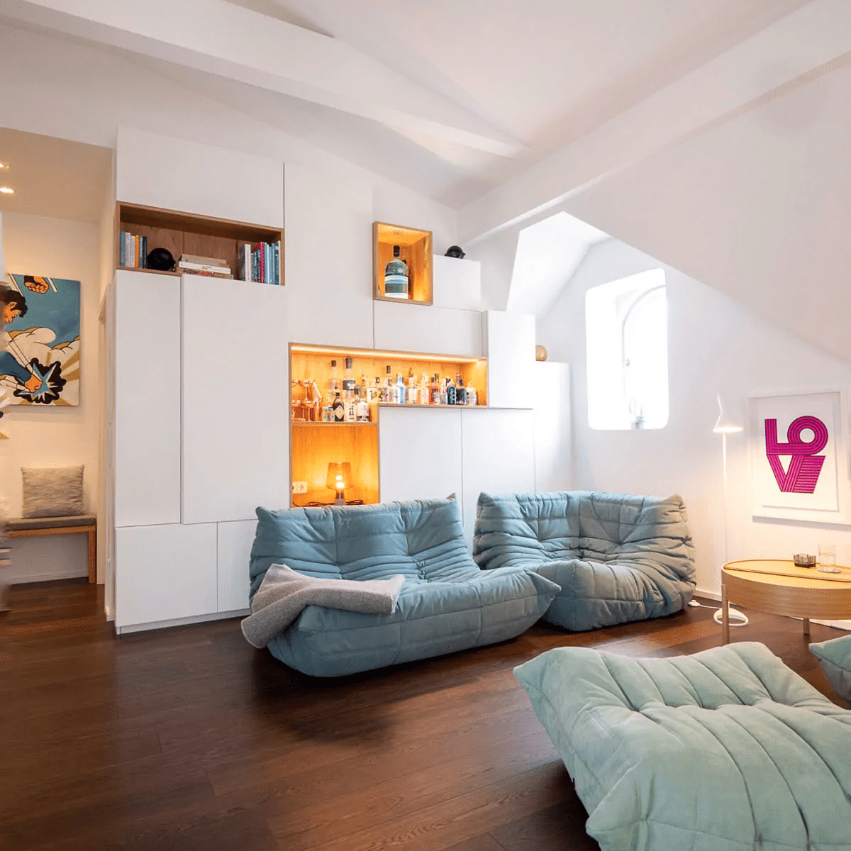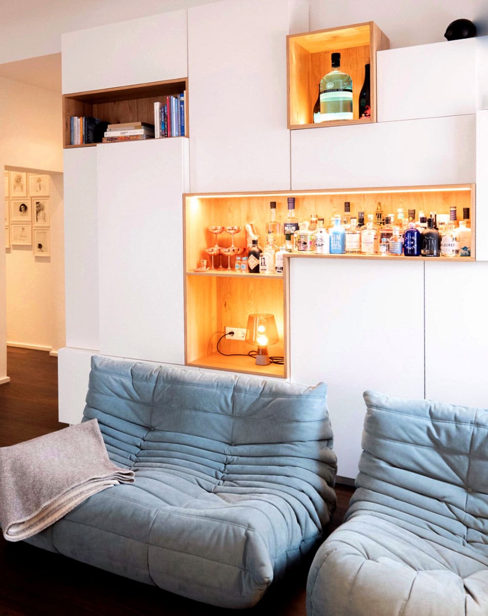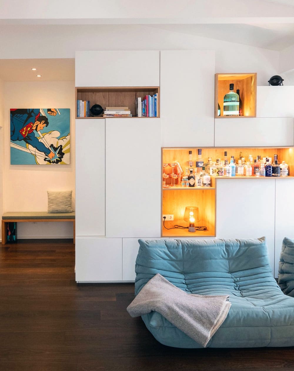Ein Blickfang sind die unterschiedlich tiefen Korpusse der Wohnwand, die unser Team millimetergenau eingepasst hat. Dadurch entsteht ein aufgelockertes Raumbild, das der Wandgestaltung eine besondere Dynamik verleiht. Trotz der modernen Dekoration wirkt diese maßgefertigte Wohnwand gemütlich warm und bleibt dabei absolut zeitlos.