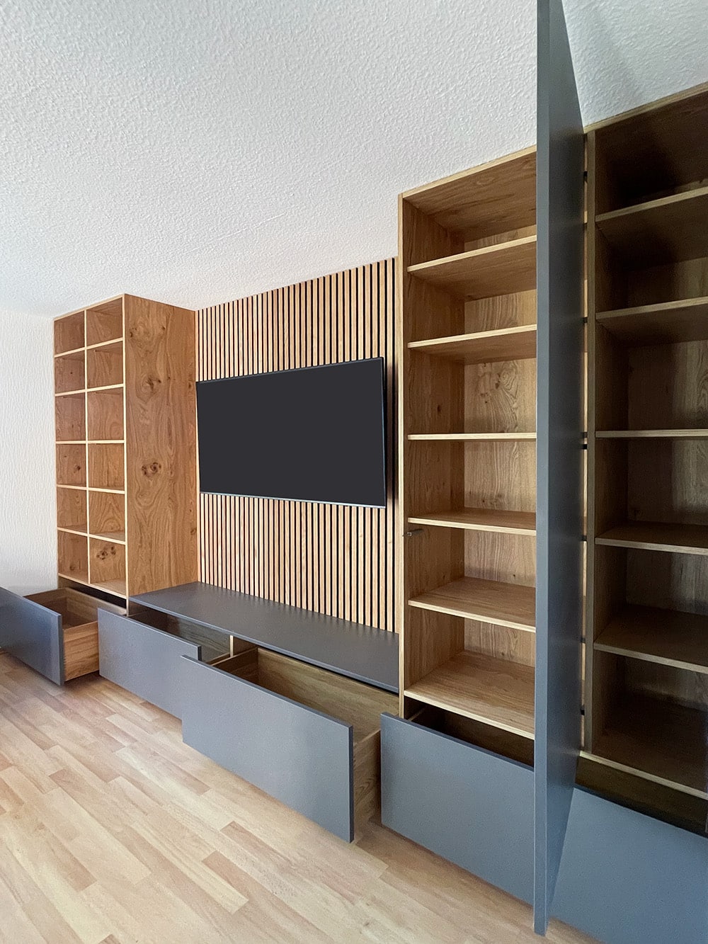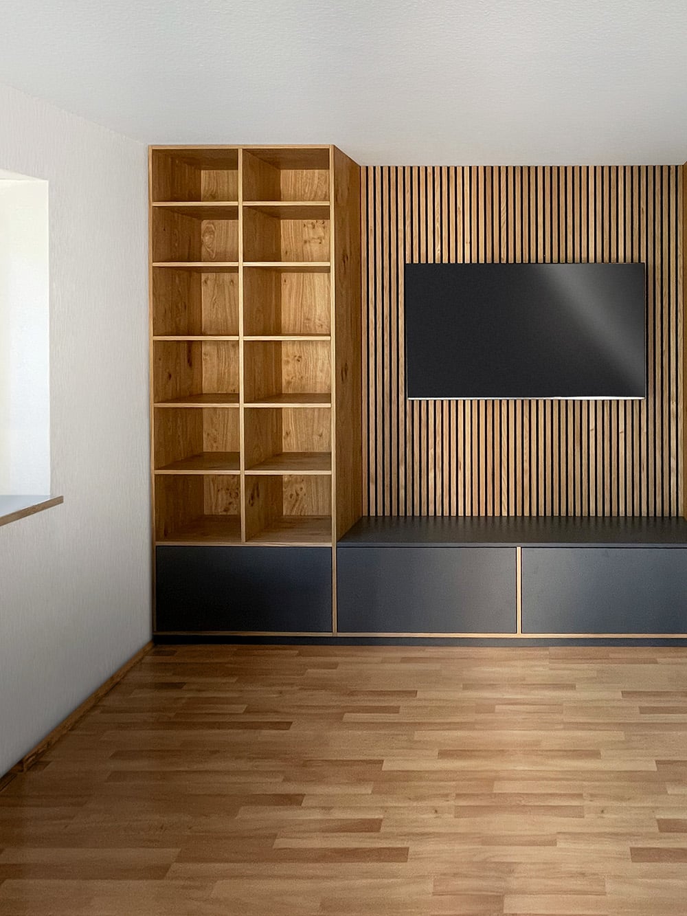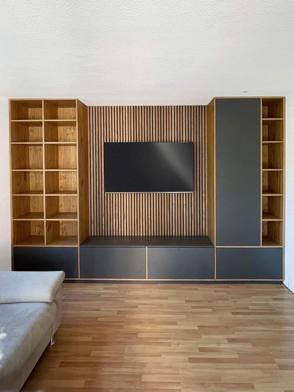 Die Material-Kombination aus edlem Echtholzfurnier in Eiche in elegantem Mattgrau verleiht dem Möbelstück einen exklusiven Look. Auch die bewusst hervorgehobenen Sichtkanten sorgen für eine harmonische Integration der TV-Wand in den Raum. Unser Kunde ist begeistert von der Umsetzung seiner Idee. Das Ergebnis ist ein stilvoller Hingucker, der das Wohnzimmer zu einem behaglichen Rückzugsort für die gesamte Familie macht.