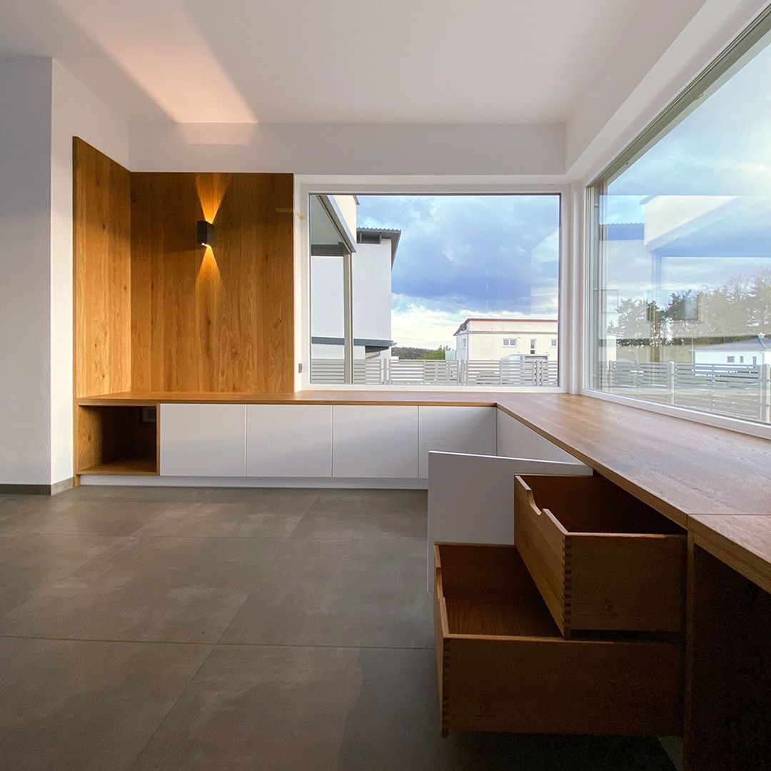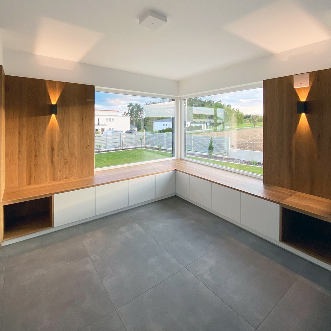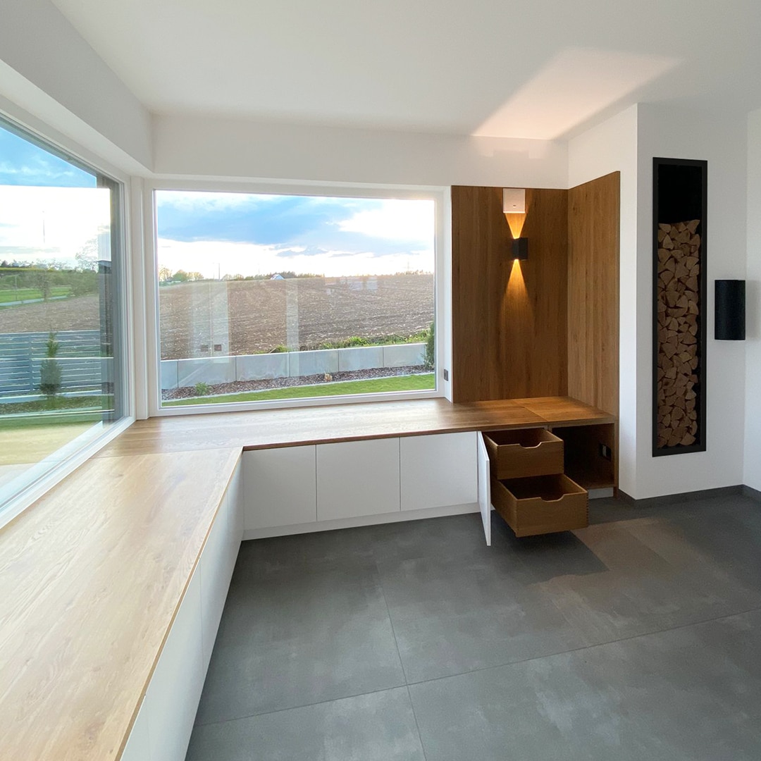 Im Raum Nürnberg haben wir für unseren Kunden eine nicht genutzte kahle Fensterecke in eine einladende Oase verwandelt. Durch die kreative Gestaltung einer Sitz- und Leseecke wurde ein Platz zum Verweilen geschaffen, der dem gesamten Raum eine exklusive und gemütliche Atmosphäre verleiht. Der Blick in den Garten und die Natur der Umgebung hat nun endlich einen angemessenen Rahmen gefunden.