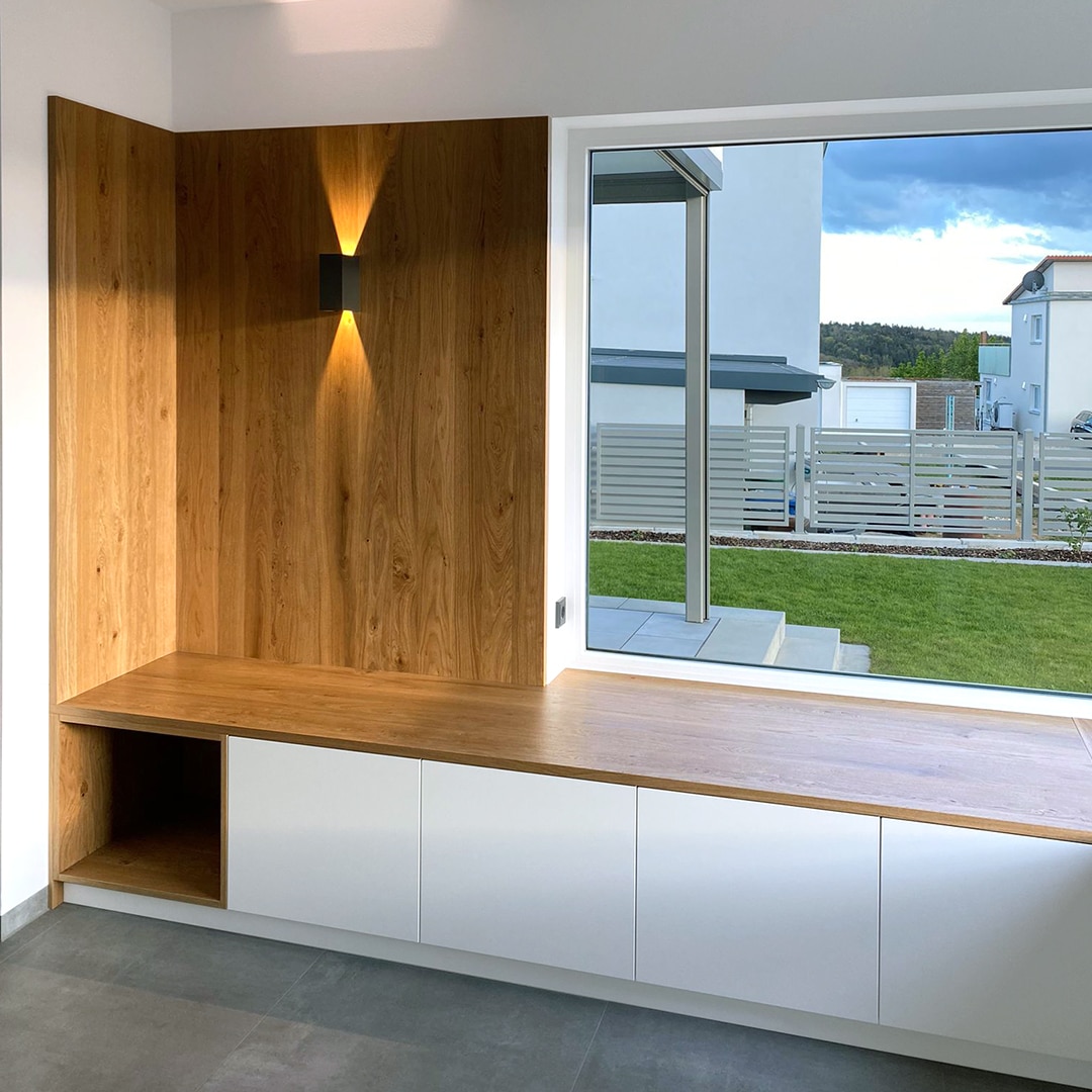 Das Highlight dieses Projekts ist die raffinierte Auskleidung mit edlem Eichen-Echtholzfurnier, das mit Elementen in zeitlosem Weiß kombiniert wurde. Eine Materialauswahl, die das Gefühl von Luxus verstärkt. Die eleganten Lichtstrahler, die wir gekonnt in die Verkleidung integriert haben, verleihen dem Ensemble einen warmen Touch. Unter der Sitzfläche entstand zusätzlicher Stauraum, der praktische Aufbewahrungsmöglichkeiten bietet, ohne das elegante Gesamtbild zu stören.