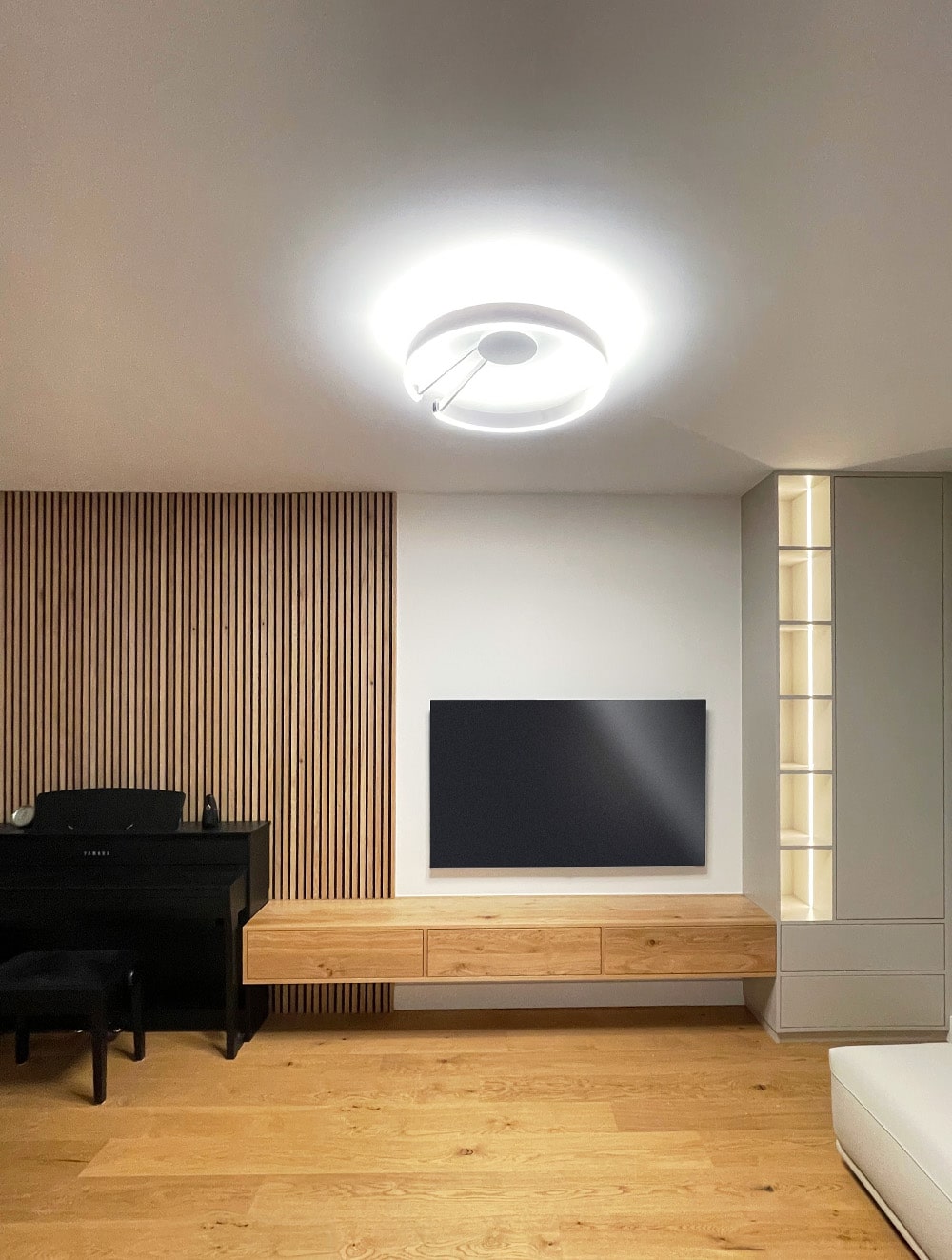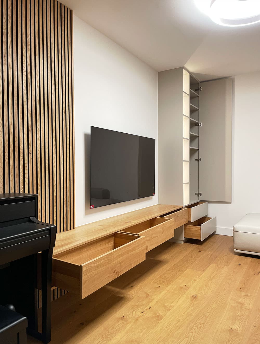 Ein Kunde aus Fürth hat sich ein Wohnzimmer mit mehr Gemütlichkeit gewünscht und unser Team hat für ihn eine maßgefertigte Fernsehwand entworfen. Sie wertet nicht nur den TV-Bereich optisch auf, sondern hilft, das gesamte Interior des Wohnzimmers zu verschönern. Besonders hervorzuheben sind die Holzpaneele hinter dem Fernseher, die das Design auflockern und die Raumakustik optimieren.