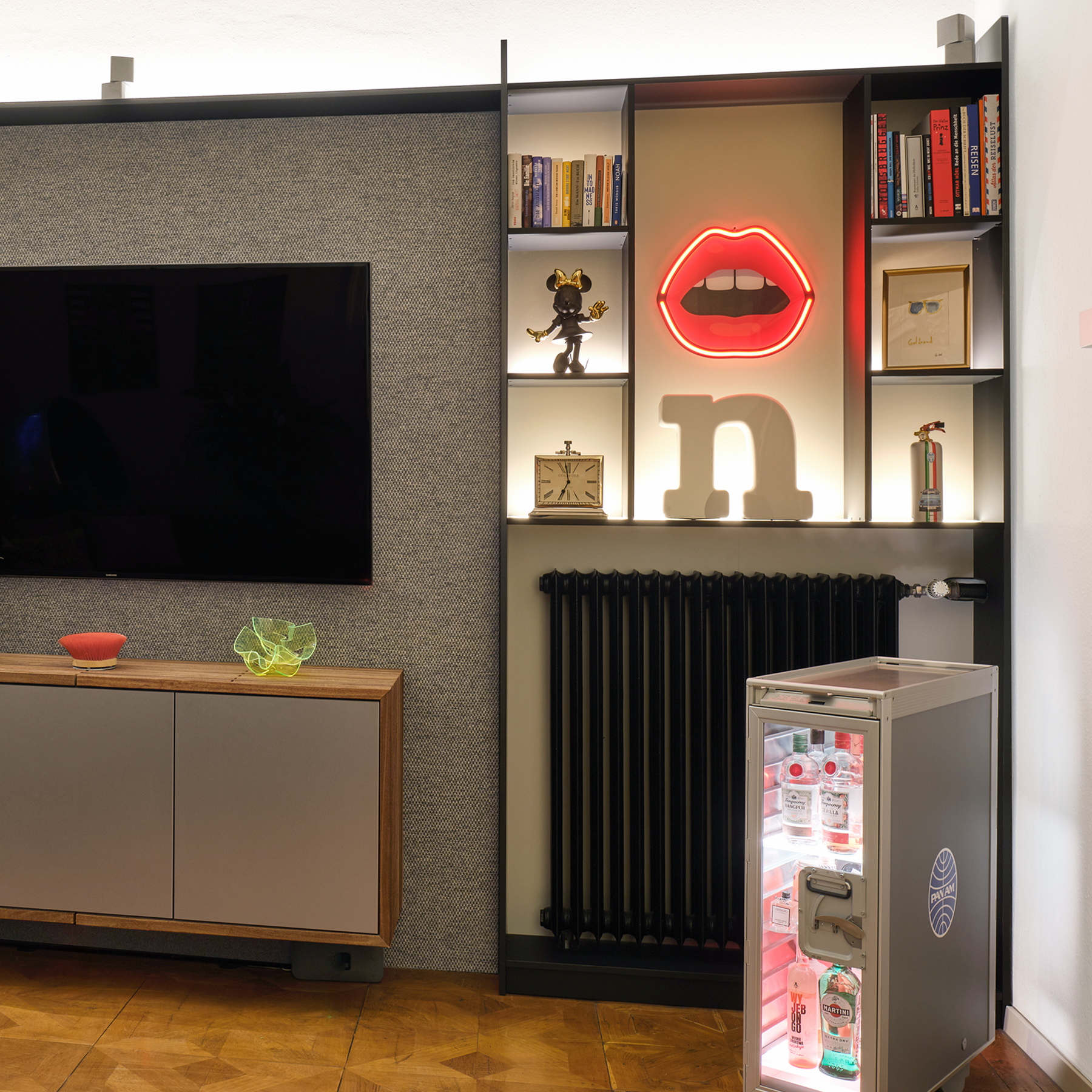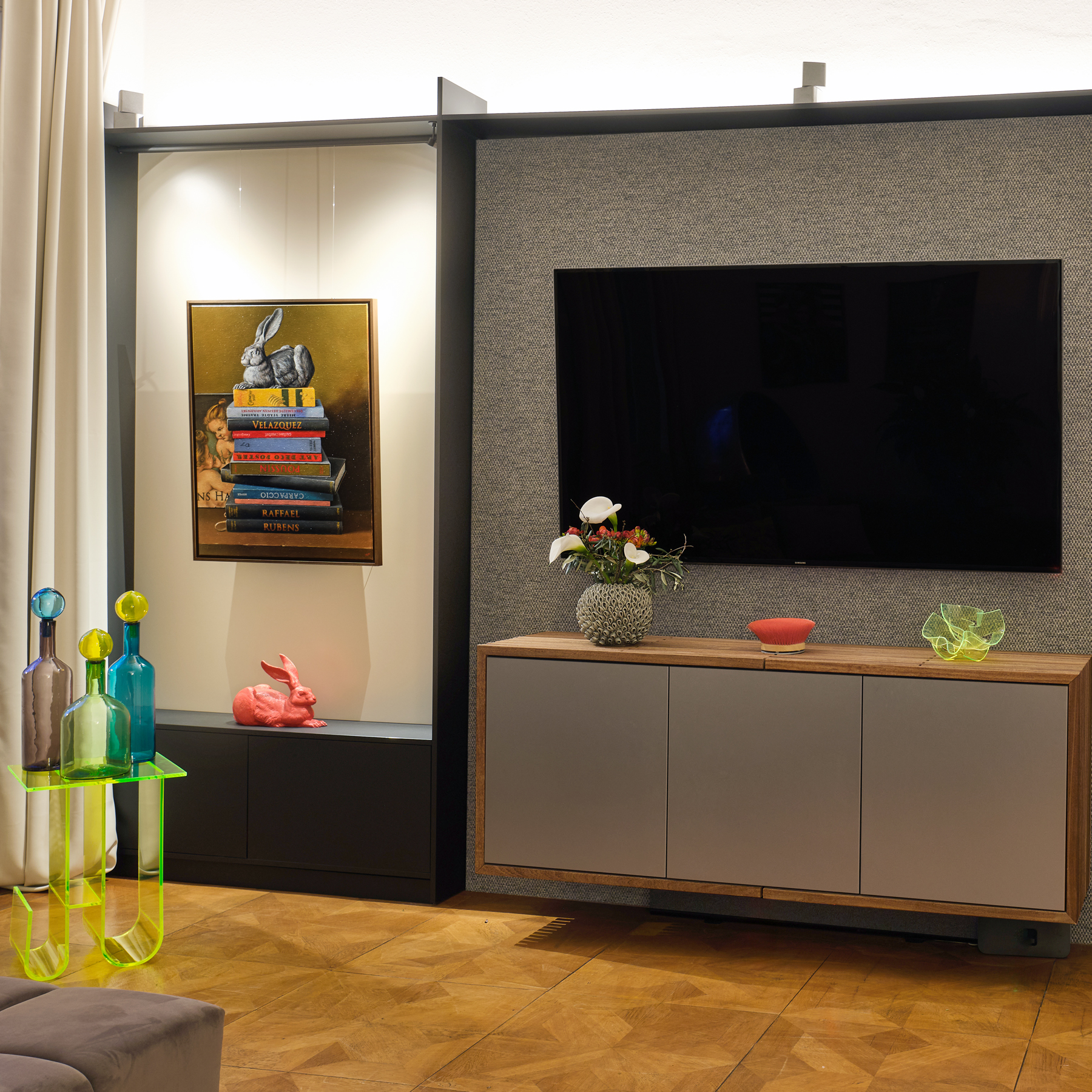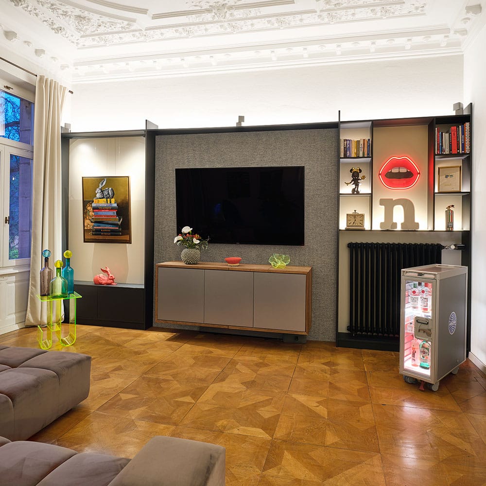 Für einen Nürnberger Kunden haben wir diese maßgefertigte TV-Wand umgesetzt. Die Herausforderung bestand darin, das bestehende Sideboard und die Heizung geschickt zu integrieren. Zudem lieben unsere Kunden innovatives Design in Verbindung mit moderner Kunst. All das konnte unser Team mit diesem Entwurf überzeugend umsetzen.